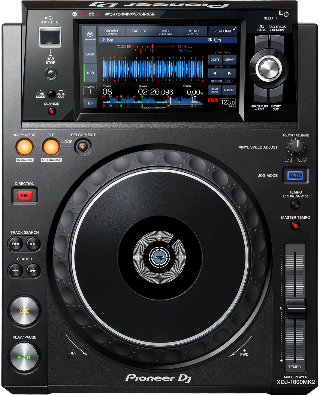 Based on its predecessor, the XDJ-1000MK2 improves usability through enhanced track browsing and support for high-resolution FLAC and ALAC audio files. It inherits the large jog wheel and 7-inch, full-colour touch screen from the CDJ-2000NXS2, as well as features such as 8 Hot Cues and Quantize.