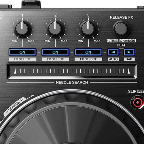 Slip Mode silently continues playback during a loop, reverse, or scratch, then brings the music back at the right point. And using Release FX you can exit complex FX patterns by selecting vinyl brake, echo or back spin and twisting the dial.