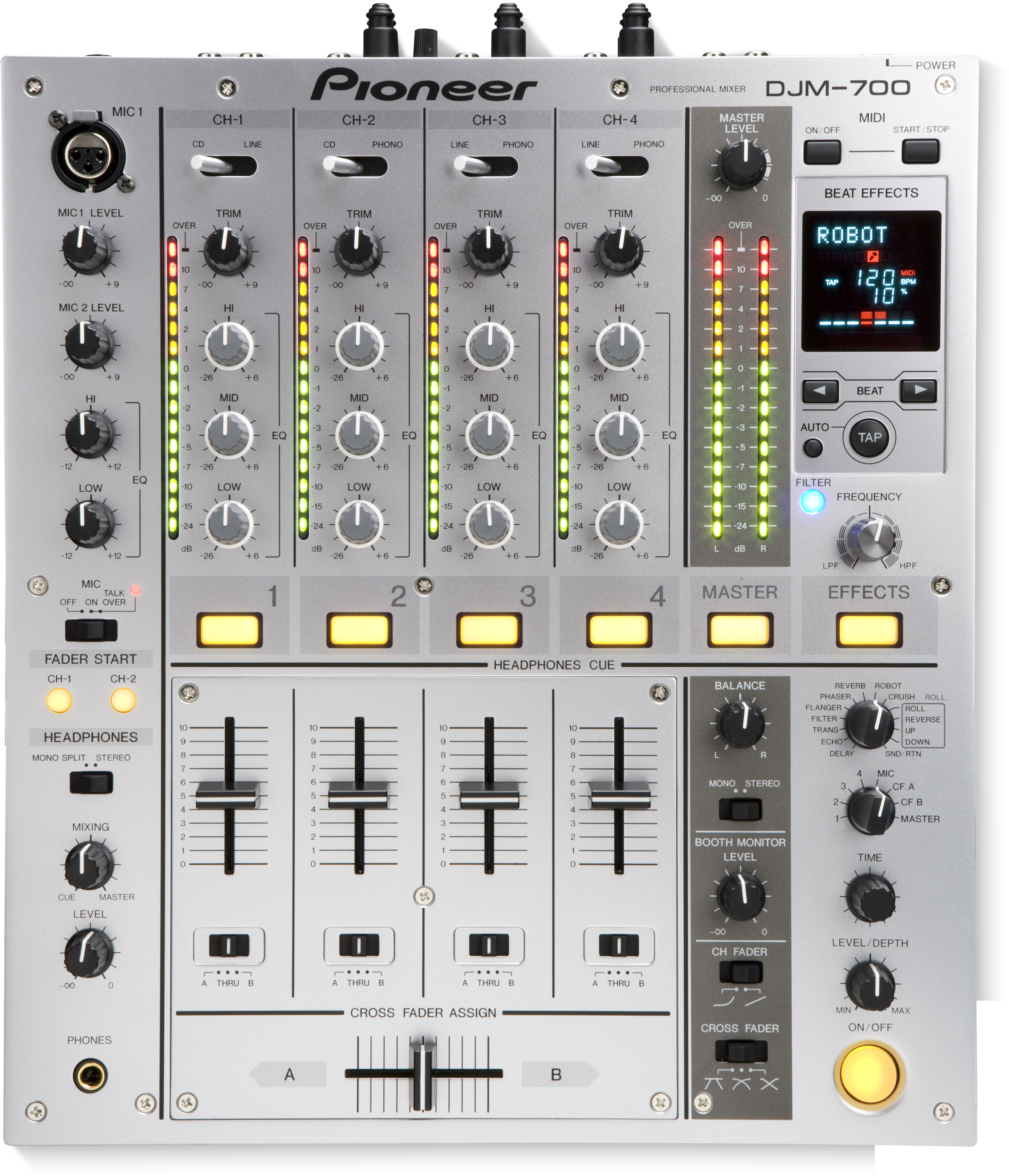 The 4-channel mixer inherits the sound quality of the DJM-800 and DJM-1000, it also includes some key features including MIDI connectivity, 49 assignables, cutting edge digital effects and a filter on pre-out so you can filter the effects.