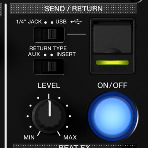 Use built-in FX and an external FX unit at the same time. Simply connect external hardware via Aux or your iPhone/iPad via USB to engage instrument and FX apps - try it with the RMX-1000 for iPad, or DJM-REC.