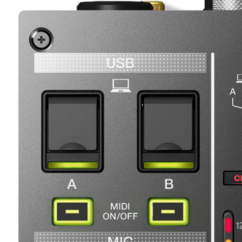 2 USB ports and a top-loaded A/B switcher let you hook-up 2 laptops for seamless DJ transitions. 4 Phono inputs allow you to connect a turntable to each channel.