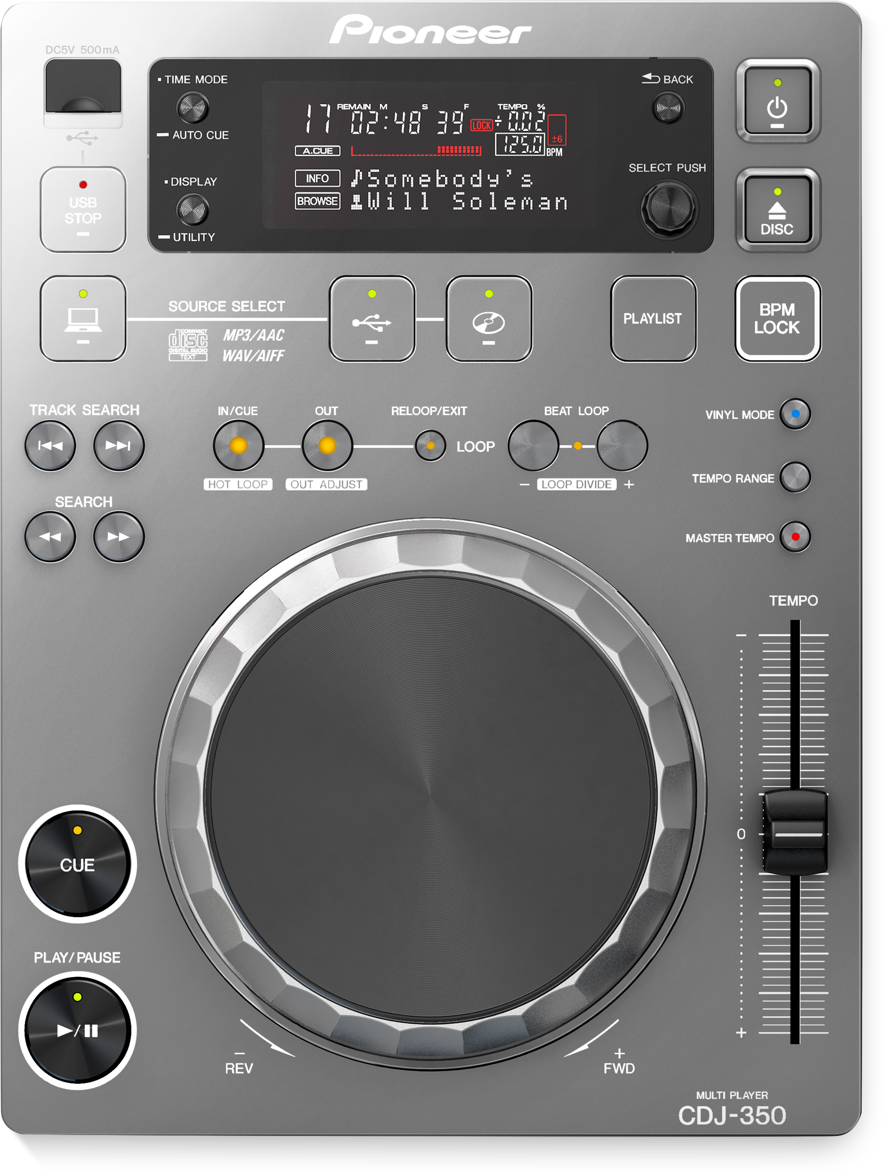The entry-level CDJ-350 inherits many traits from our pro-DJ decks, making it a perfect springboard to professional sounding sets. Play from CDs and USB devices, or connect to your PC/Mac for plug-and-play control of compatible DJ software.