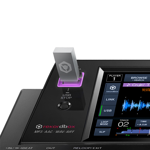 Colour-code your playlists in rekordbox (e.g. red for techno and blue for drum & bass), and the light around the USB port will reflect that setting for easy identification.