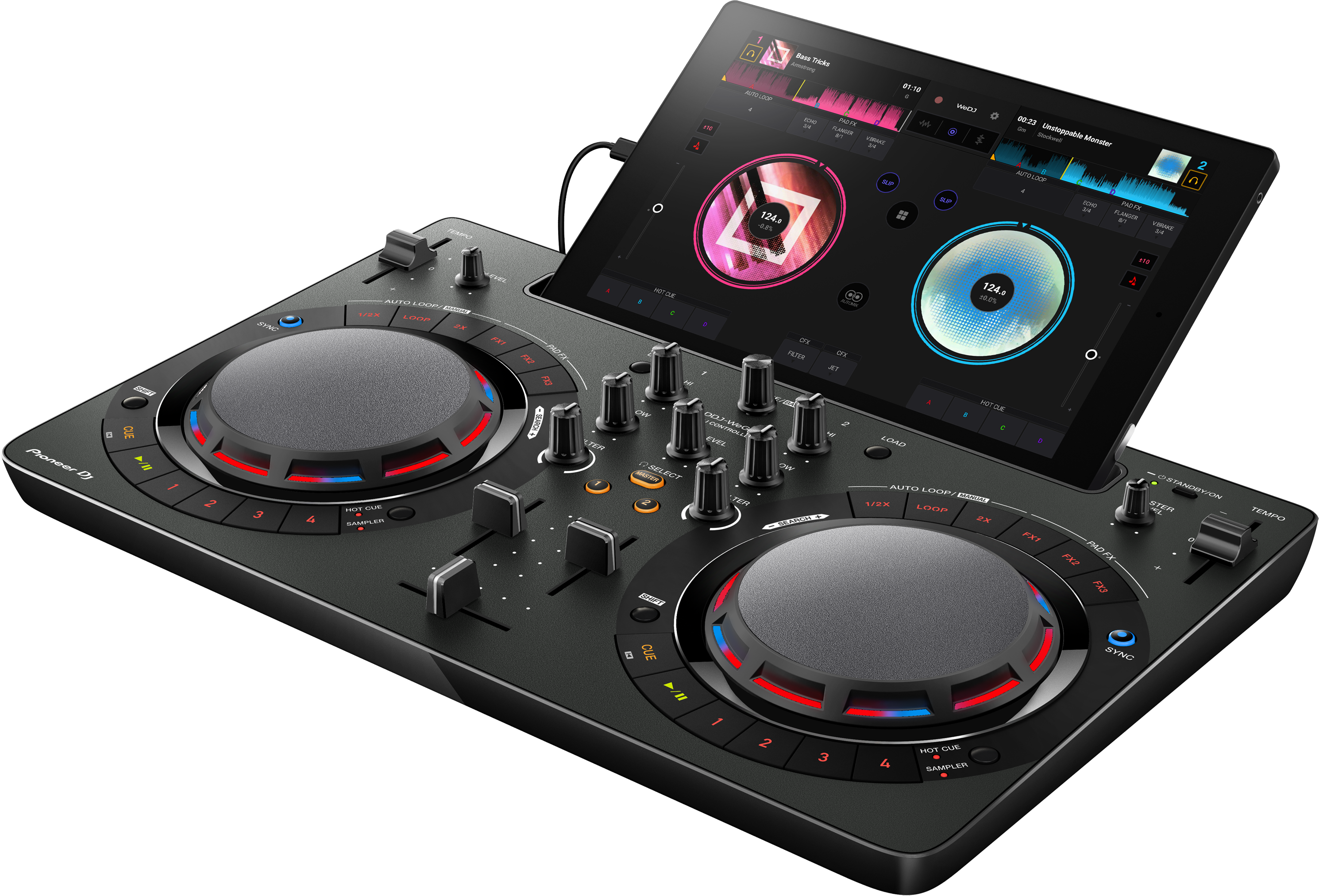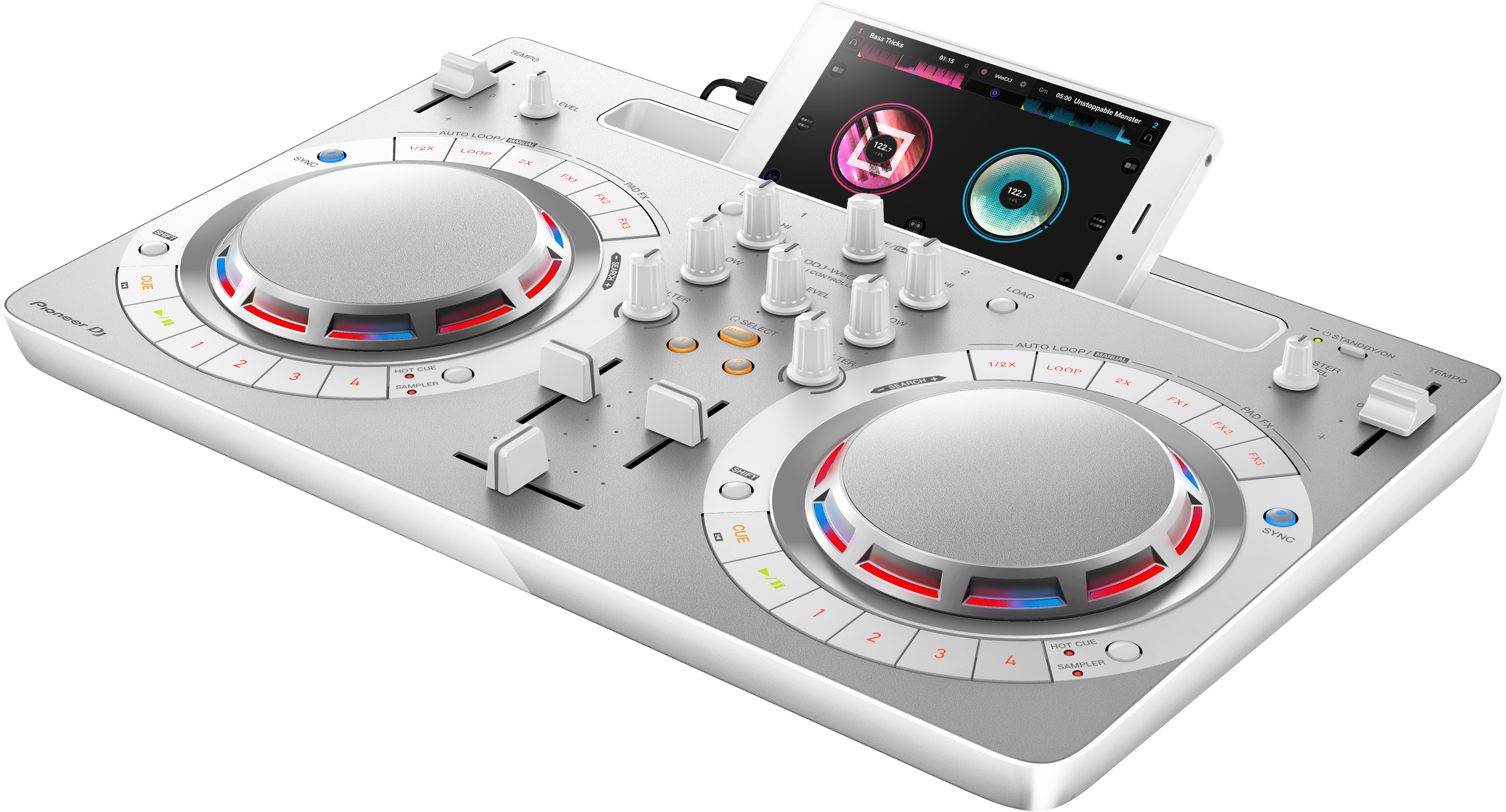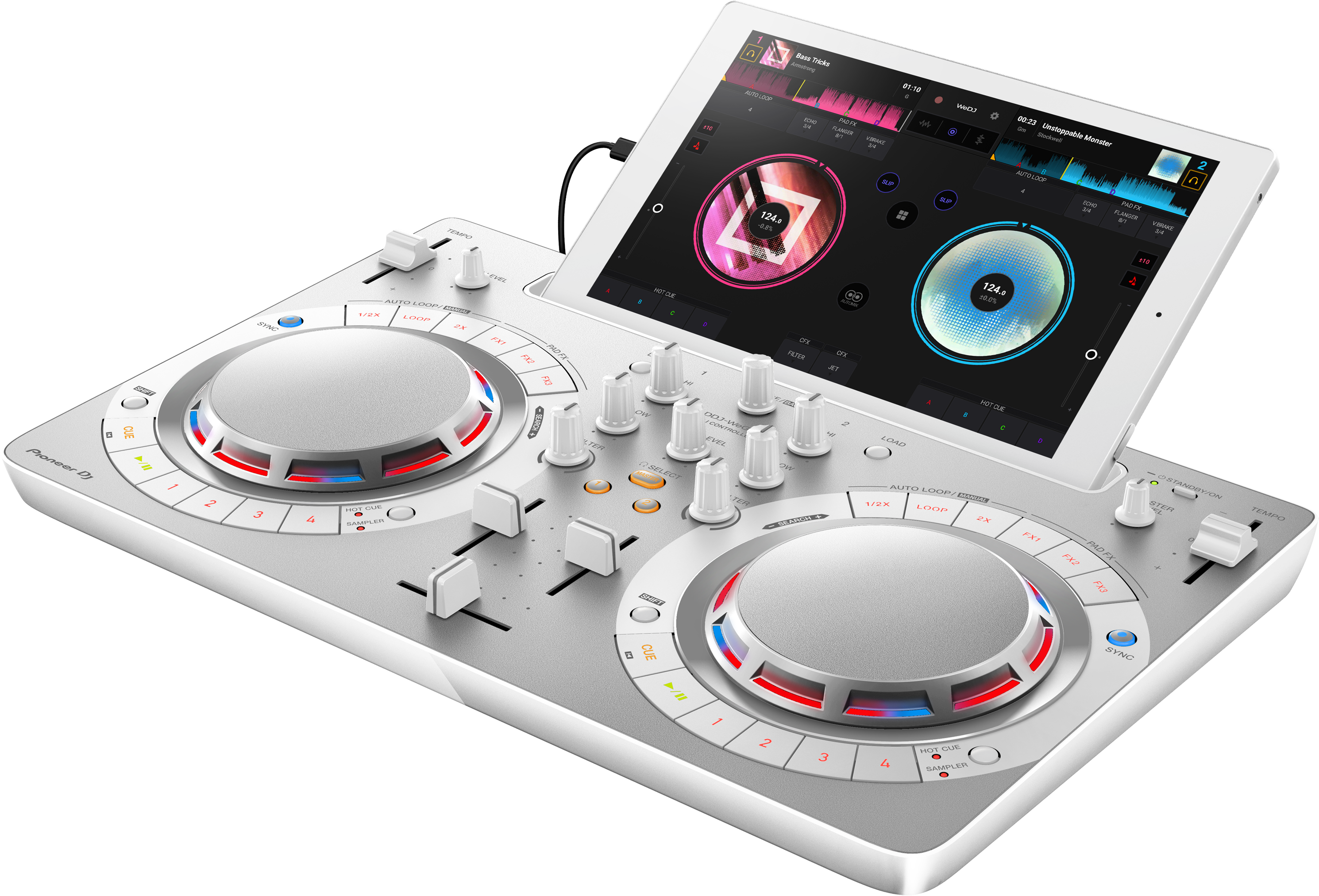 Il controller DDJ-WeGO4 è il compagno ideale di WeDJ: una volta collegato, il display di WeDJ si trasforma in un'interfaccia dedicata e ottimizzata per l'utilizzo con l'hardware. E' possibile usufruire del controllo tattile delle funzioni di WeDJ toccando le jog wheel, i fader e i pulsanti del DDJ-WeGO4.Tutto quello che è possibile controllare verrà visualizzato sullo schermo del dispositivo Android: le forme d'onda e le informazioni sui brani.