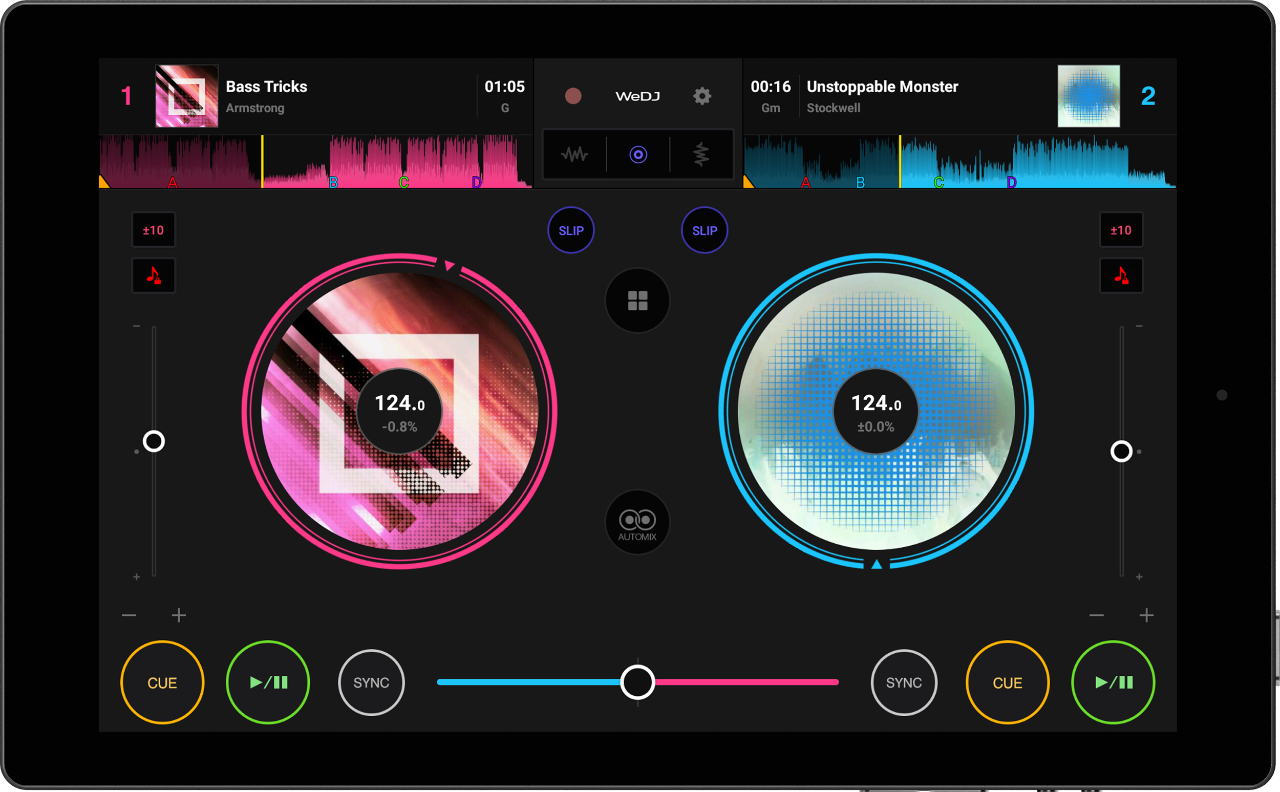 - Automix – Premi il pulsante Automix e WeDJ mixerà automaticamente il brano successivo prima del termine di quello riprodotto.