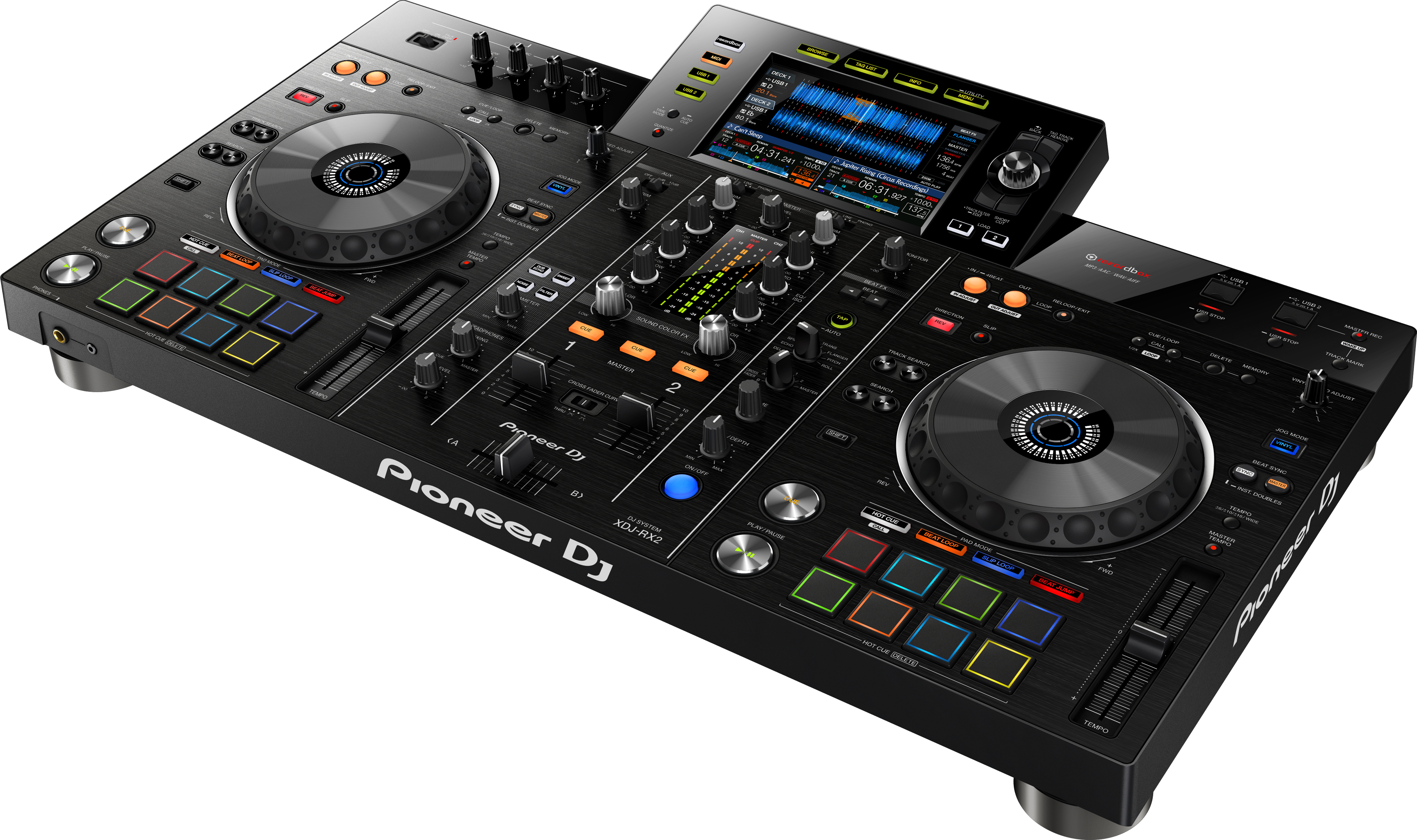 Lo schermo touch-screen da 7 pollici posizionato al centro dell'XDJ-RX2, visualizza simultaneamente le forme d'onda di entrambi i deck, fornisce informazioni dettagliate sui brani -come lo stato di sincronizzazione e la posizione di riproduzione- per renderli rapidamente visibili durante i mix e visualizzare la tastiera QWERTY sul display, per trovare più velocemente il brano successivo. Il nuovo modello ha in dotazione un grande selettore rotativo e le funzioni Needle Search, Track Filter e Short Cut ereditate dal multilettore di punta CDJ-2000NXS2. Ogni deck presenta otto grandi Performance Pad multicolor per il controllo tattile di Hot Cues, Beat Loop, Slip Loop e Beat Jump. e per mettere alla prova la propria creatività, i Beat FX e i Sound Color FX, derivati dal mixer DJM-900NXS2, vero fiore all'occhiello di Pioneer DJ.