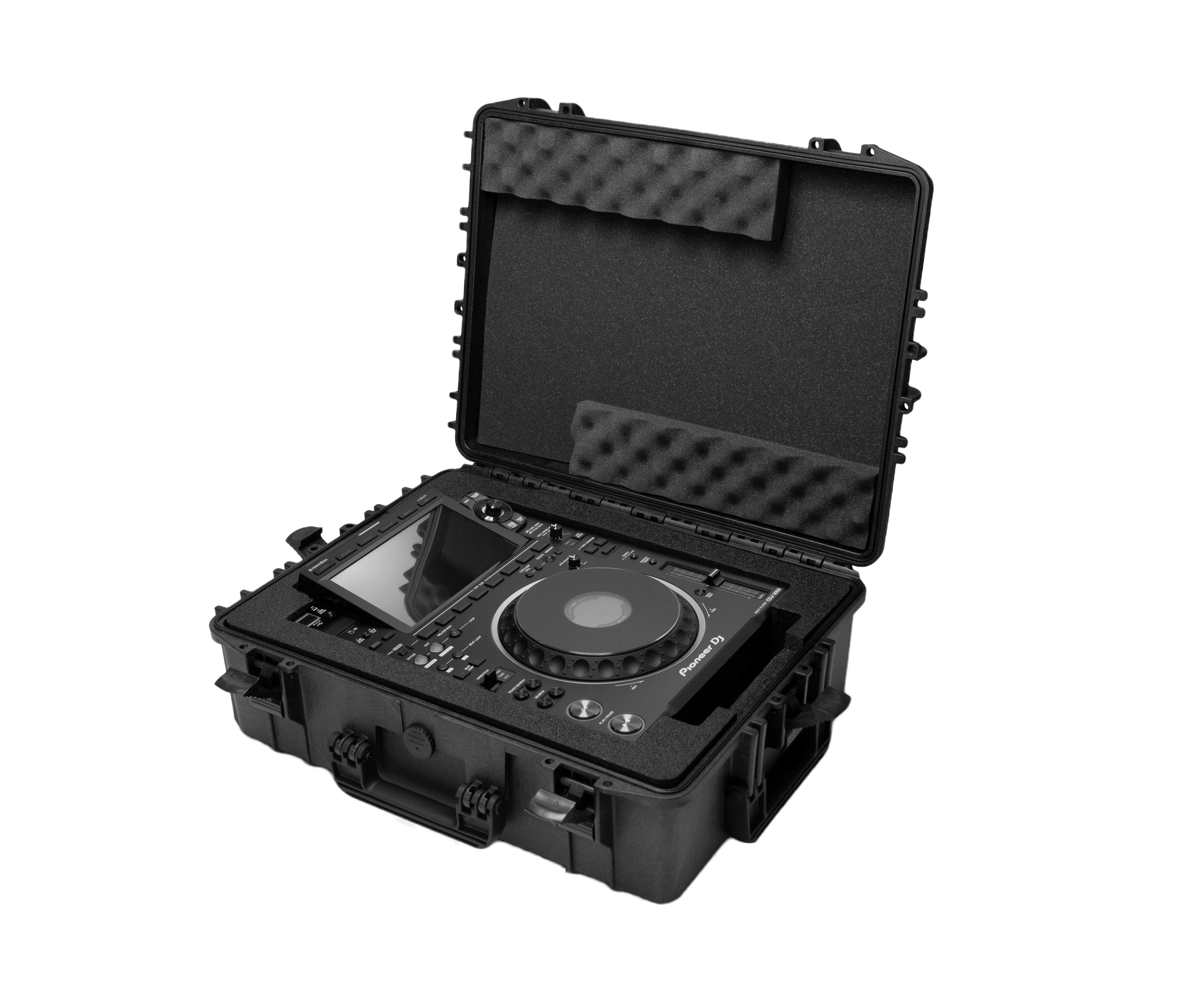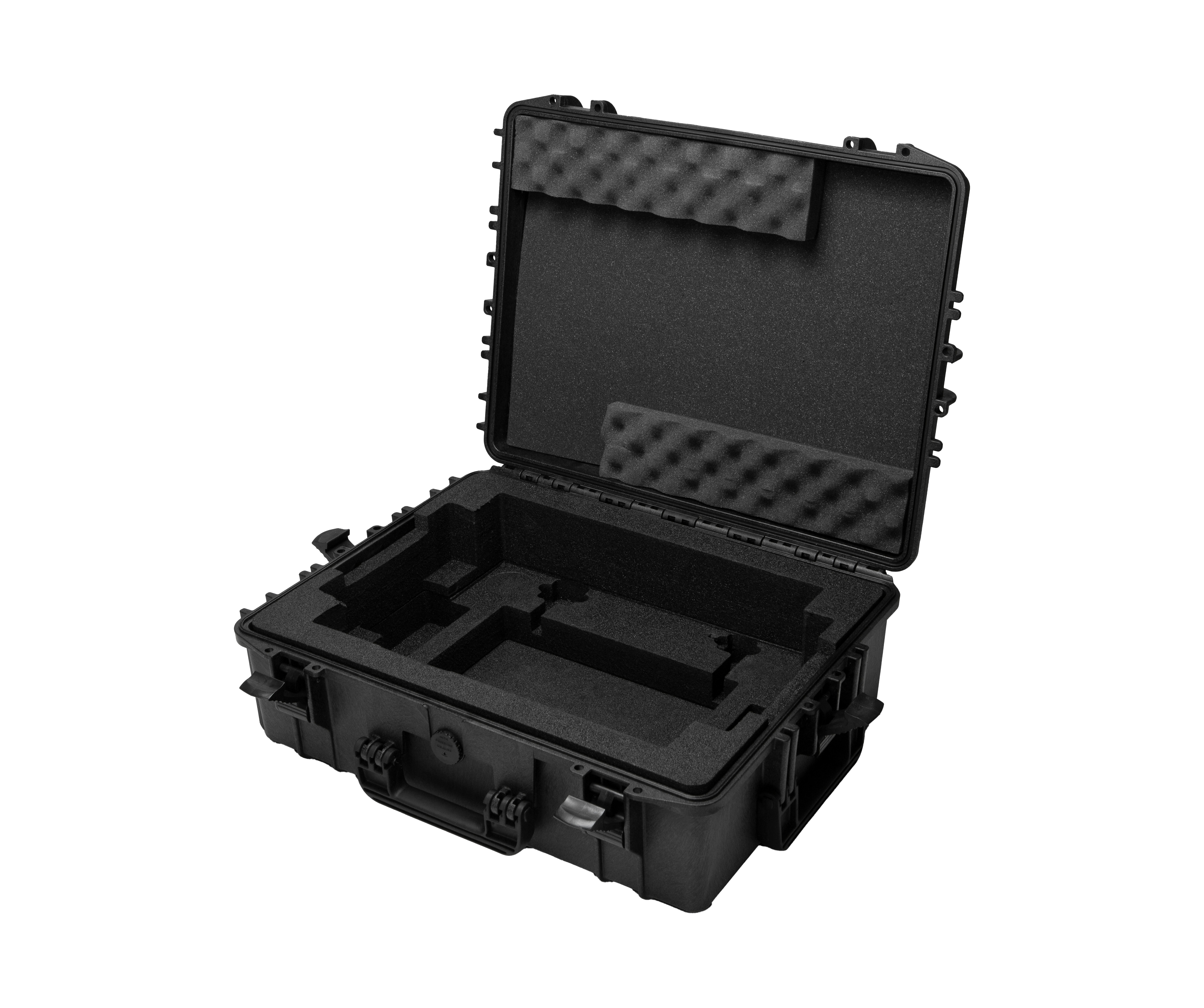 La robusta custodia impermeabile è impilabile e dotata di chiusure di sicurezza a doppio step e fessure per le mani. Il comparto dei cavi e lo spazio per la spina nell’inserto in schiuma assicurano l’ordine.