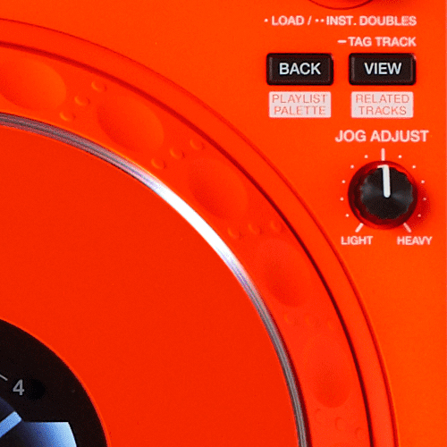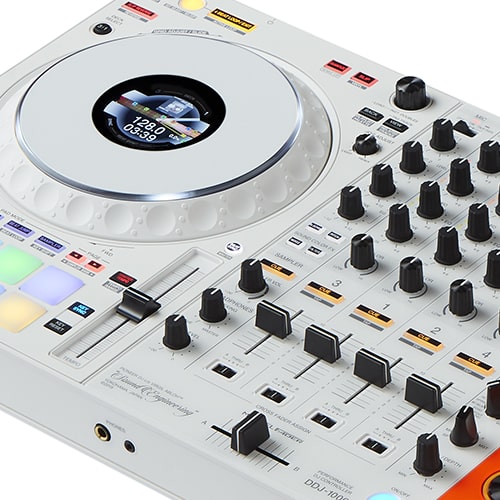 I colori asimmetrici arancione fluorescente e bianco opaco e la stampa dello slogan conferiscono un aspetto unico alla console DDJ-1000, ad alte prestazioni e portatile. Essa eredita il layout dei setup CDJ-2000NXS2 e DJM-900NXS2.