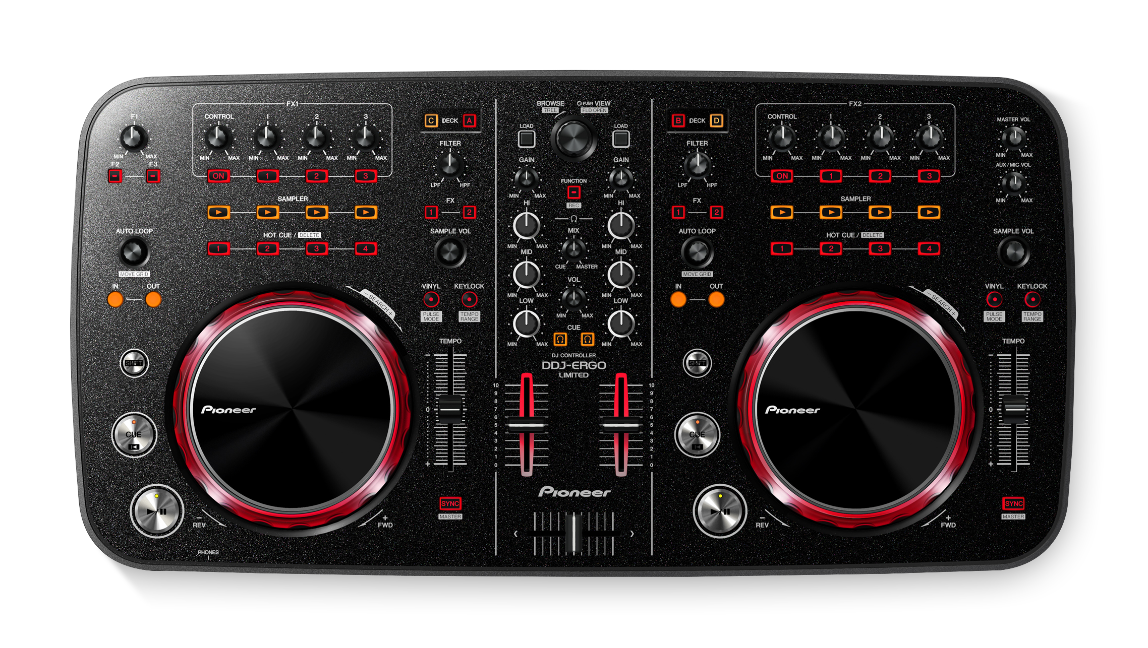 - Vanta caratteristiche della nostra gamma pro, compreso il Jog Wheel 115 millimetri e lo stesso circuito audio come i nostri mixer professionali per il master terminale di uscita;