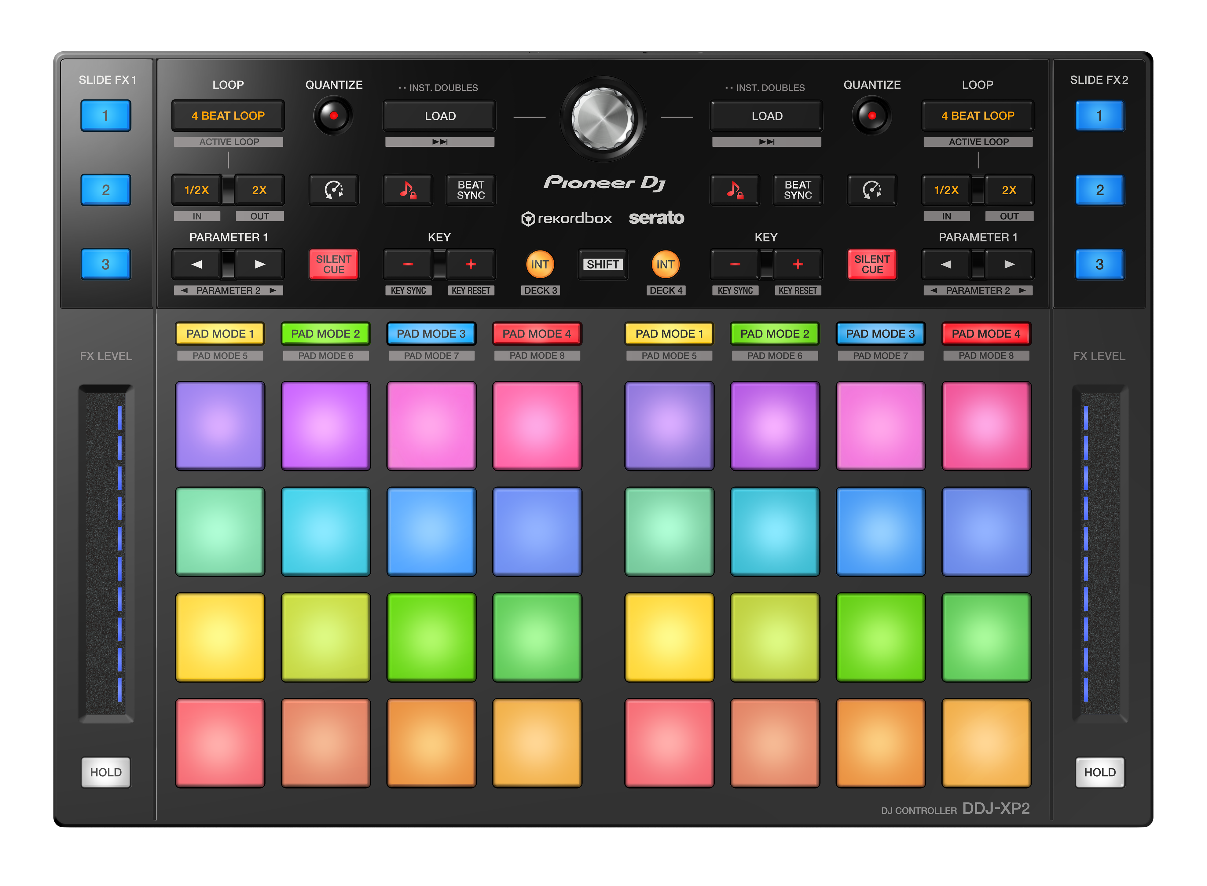 Il DDJ-XP2 esalta il tuo set-up con 32 Performance Pad multicolor robusti, per avere sulla punta delle dita poderose pad mode. Assegna controlli quali Play, Pause, Cue e Pitch up/down ai pad con la Transport mode. Utilizza i 16 pad per controllare un'unica modalità (la prima volta per Serato DJ Pro ). Attiva Silent Cue per il cue-up silenzioso dei brani con i fader aperti sul mixer e avviali subito dopo dai punti Hot Cue. Sentiti sicuro al comando delle performance DJ con i controlli per il looping del nostro mixer di punta per lo scratching DJM-S9.
