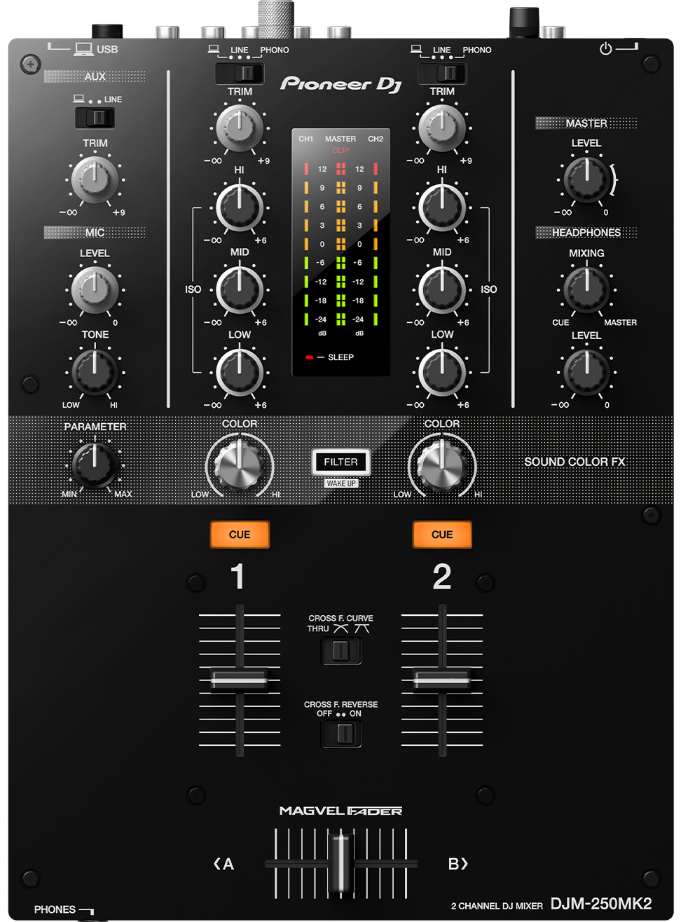 Il DJM-250MK2 ha ereditato alcune delle funzioni professionali del famoso DJM-900NXS2, ad esempio il crossfader Magvel e il filtro Sound Color FX. Con i controlli intuitivi, il layout chiaro, gli isolatori a 3 bande dedicati potrai eseguire scratching e mix in modo istintivo.