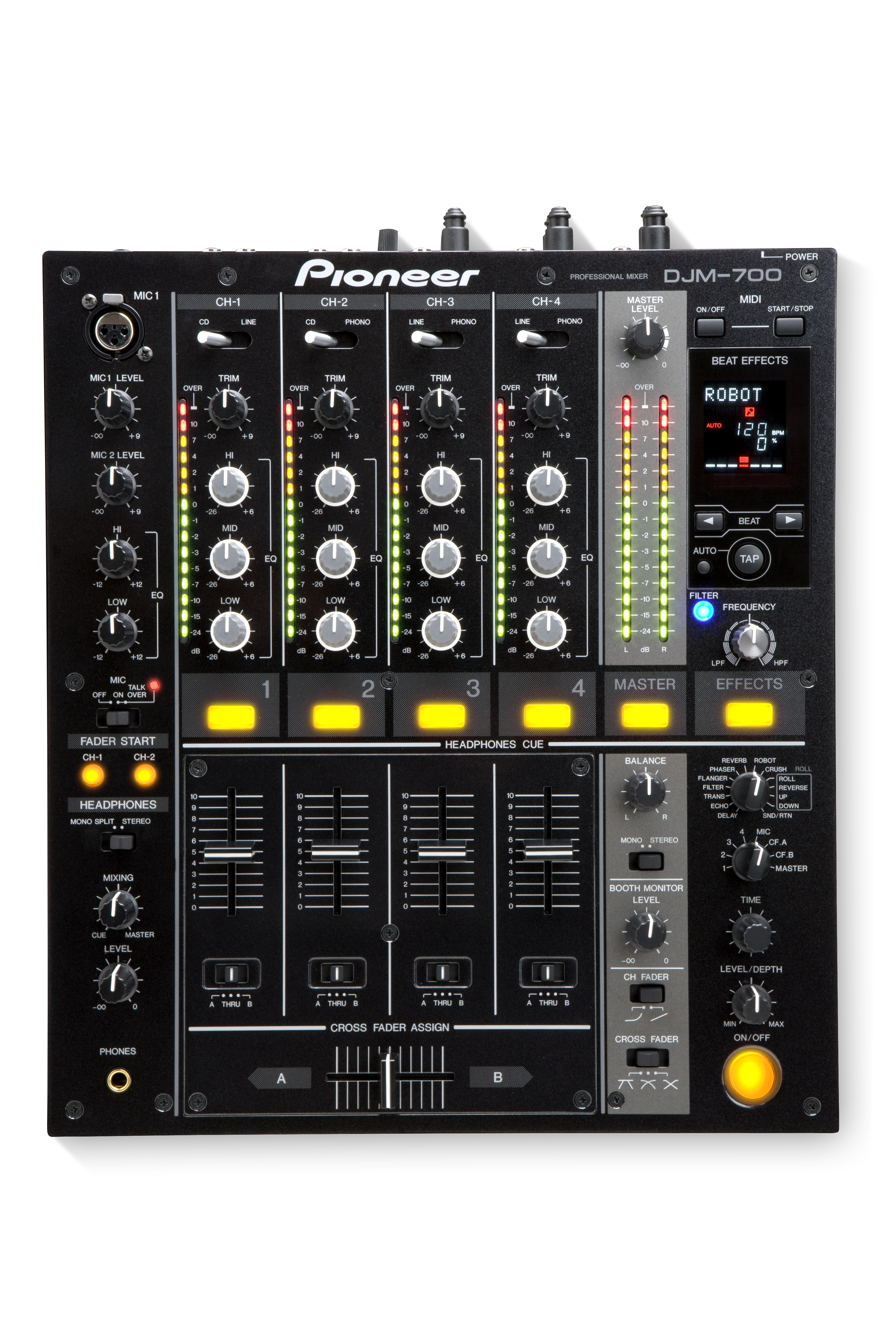 Il mixer a 4 canali eredita la qualità di suono dal DJM-800 e dal DJM-1000 e include una serie di funzioni quali connettività MIDI, 49 controlli assegnabili, effetti digitali all'avanguardia e un filtro preout che permette di filtrare gli effetti sonori.