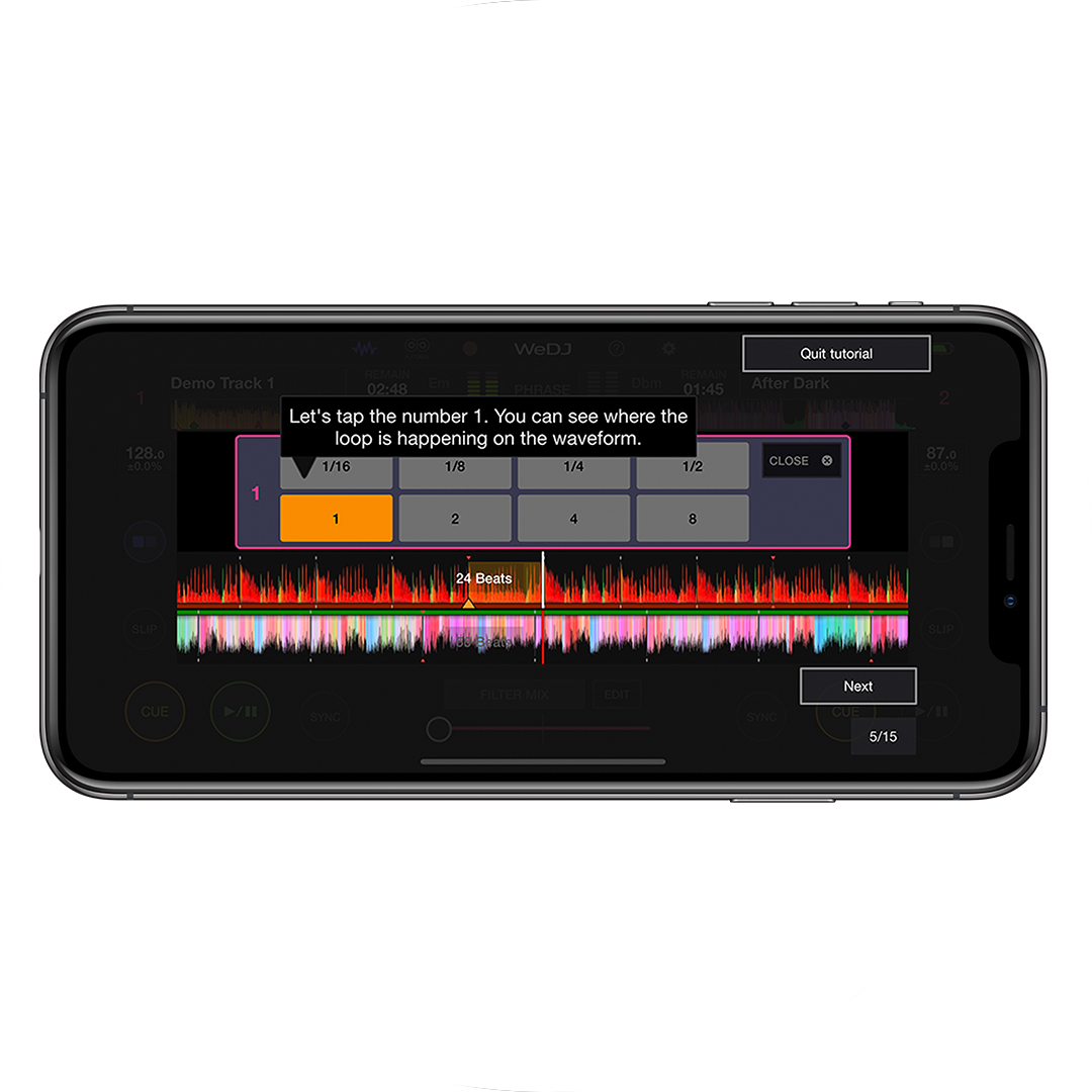 Mixa la musica della tua libreria iTunes o esegui lo streaming di brani popolari e scopri perle sconosciute con Beatport LINK. Se sei solo agli inizi con il mixaggio, ora WeDJ per iPhone vanta le funzioni Tutorial e Pop-Hint per insegnarti le basi. Che sia la prima volta che mixi suoni o che tu lo faccia già da un po' di tempo, adorerai la funzione Transition FX per eseguire transizioni senza soluzione di continuità.