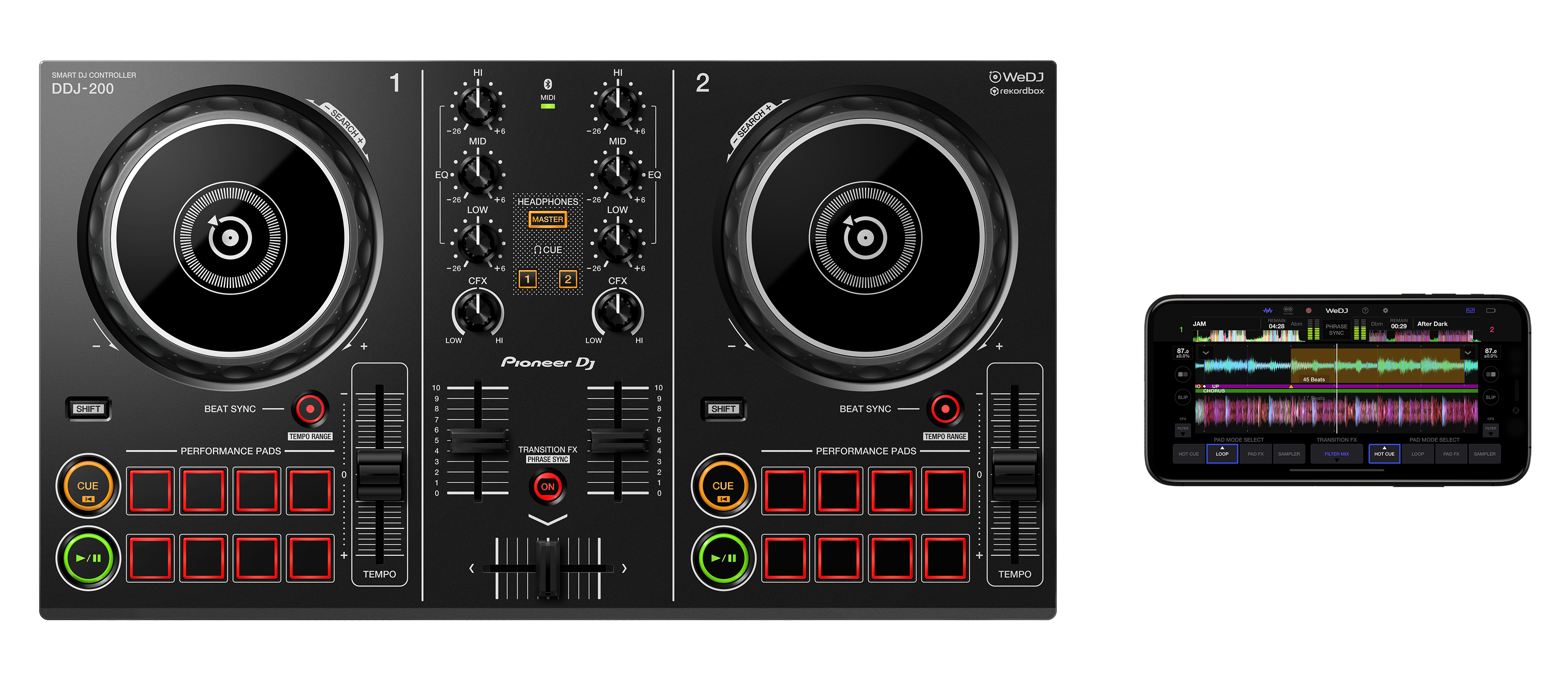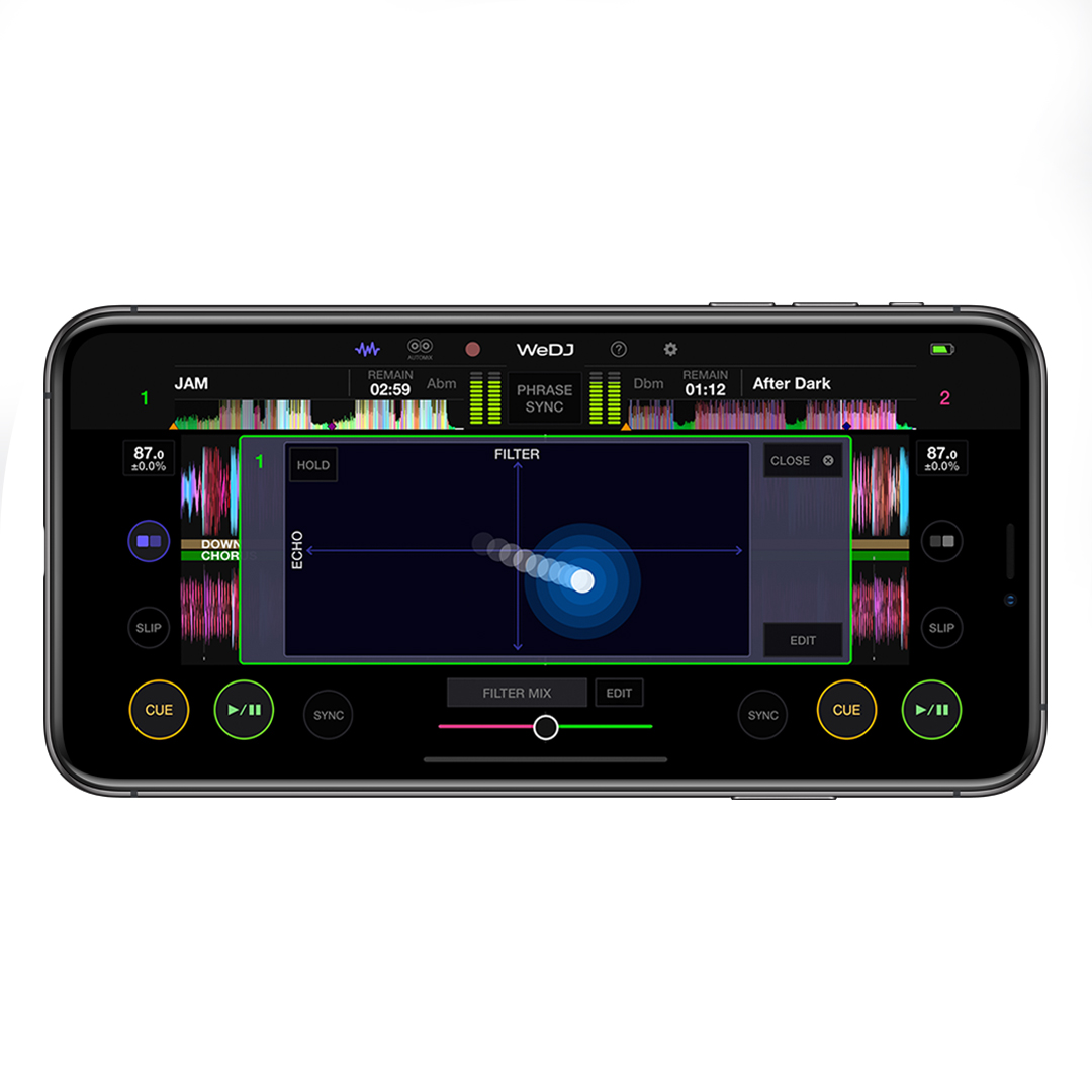 Inizia a mixare musica con l'iPhone con la nostra app WeDJ. Prendi confidenza con le tecniche di mixaggio, grazie all'interfaccia a colori animata a 2 canali con forme d'onda, jog wheel, pulsanti play/cue, tempo slider e crossfader. Quando sei pronto a dare un tocco in più alla tua performance, collega la console intelligente DDJ-200 per usufruire del controllo tattile delle funzioni dell'app.
