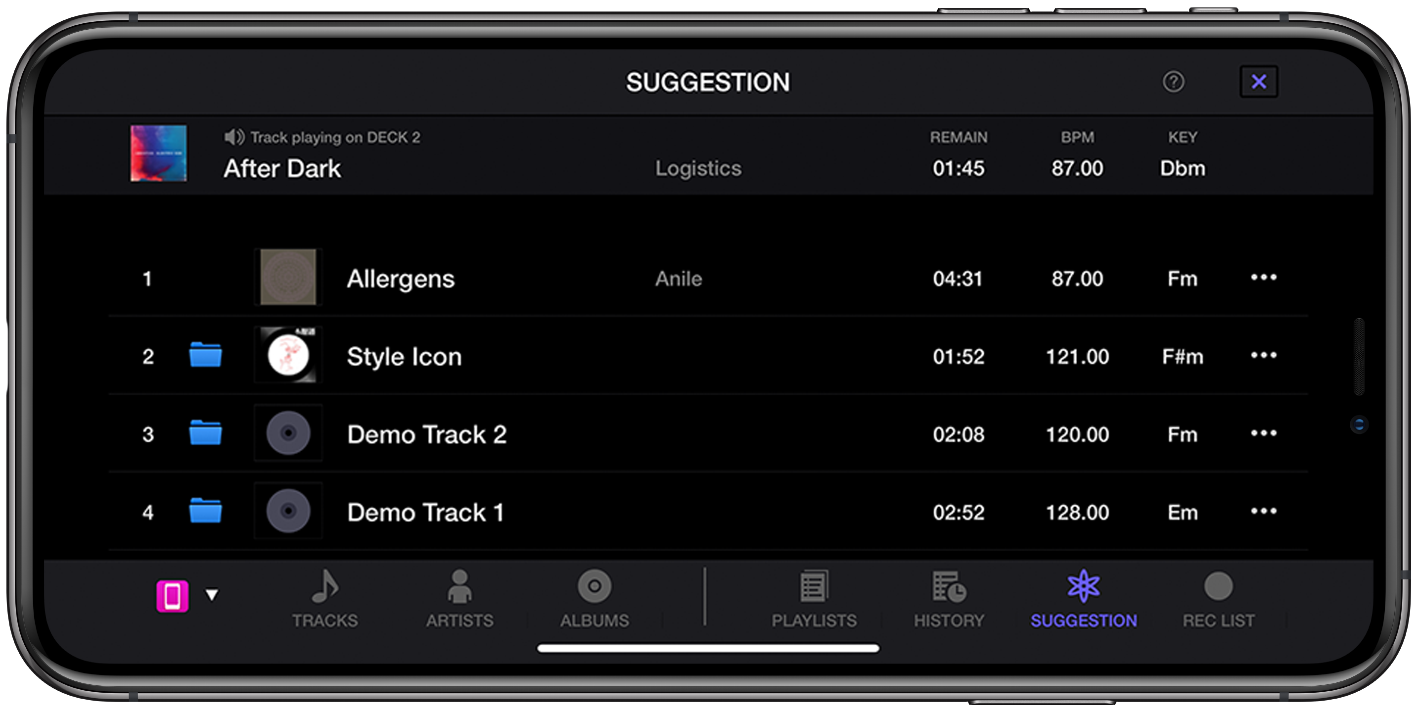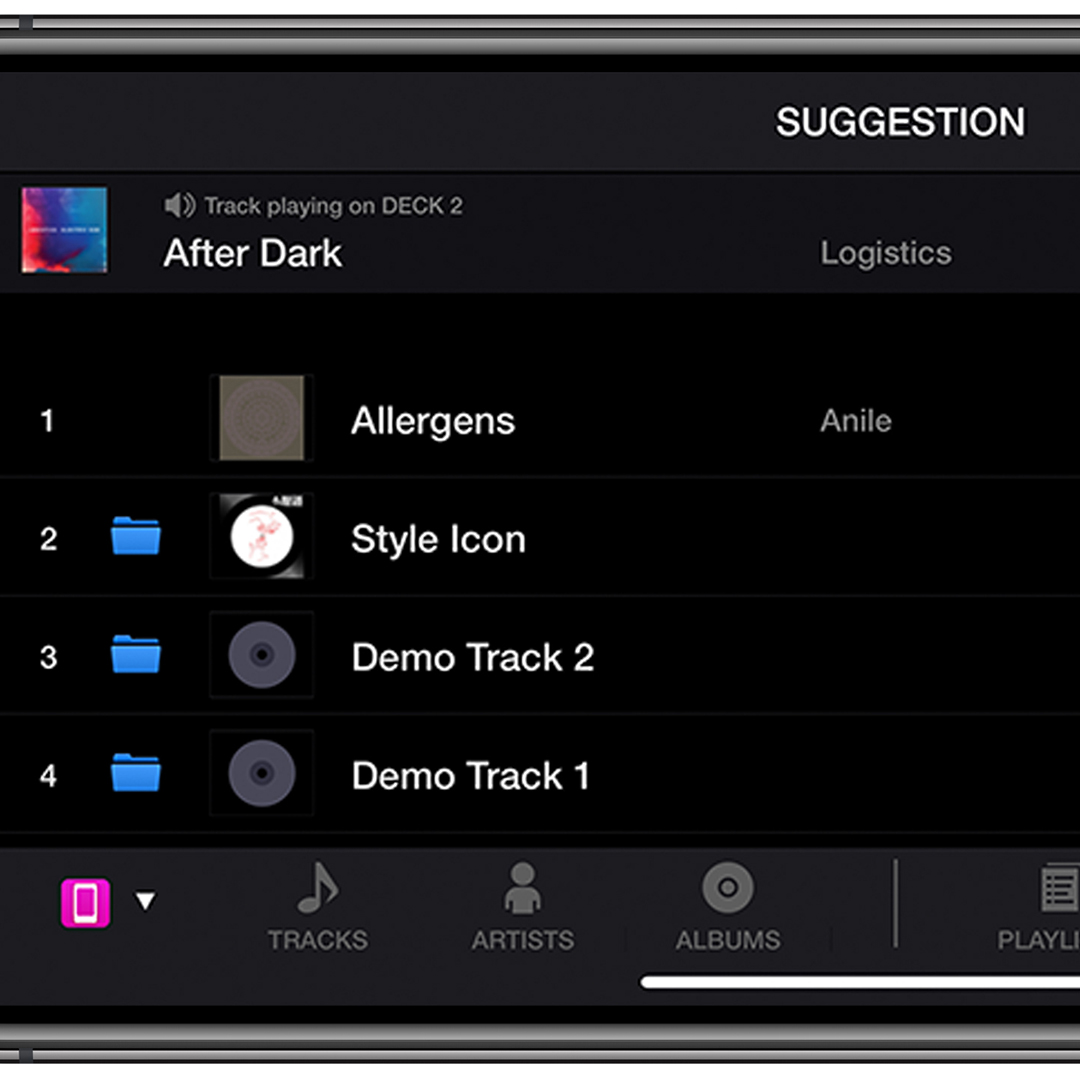 Scegli facilmente la canzone successiva con la funzione Suggestion dei brani, che ti mostra la musica con chiave e BPM simili a quelli della canzone che stai riproducendo.