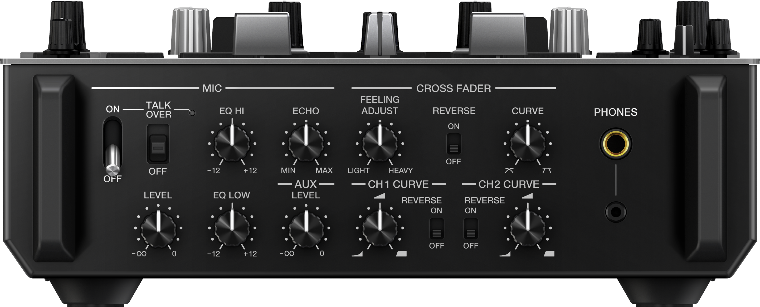 | 出力端子 | MASTER × 2(XLR×1、RCA×1) BOOTH × 1(1/4 inch TRS jack) PHONES × 2 (1/4 inch stereo phone jack x 1、3.5mm stereo mini jack x 1) |