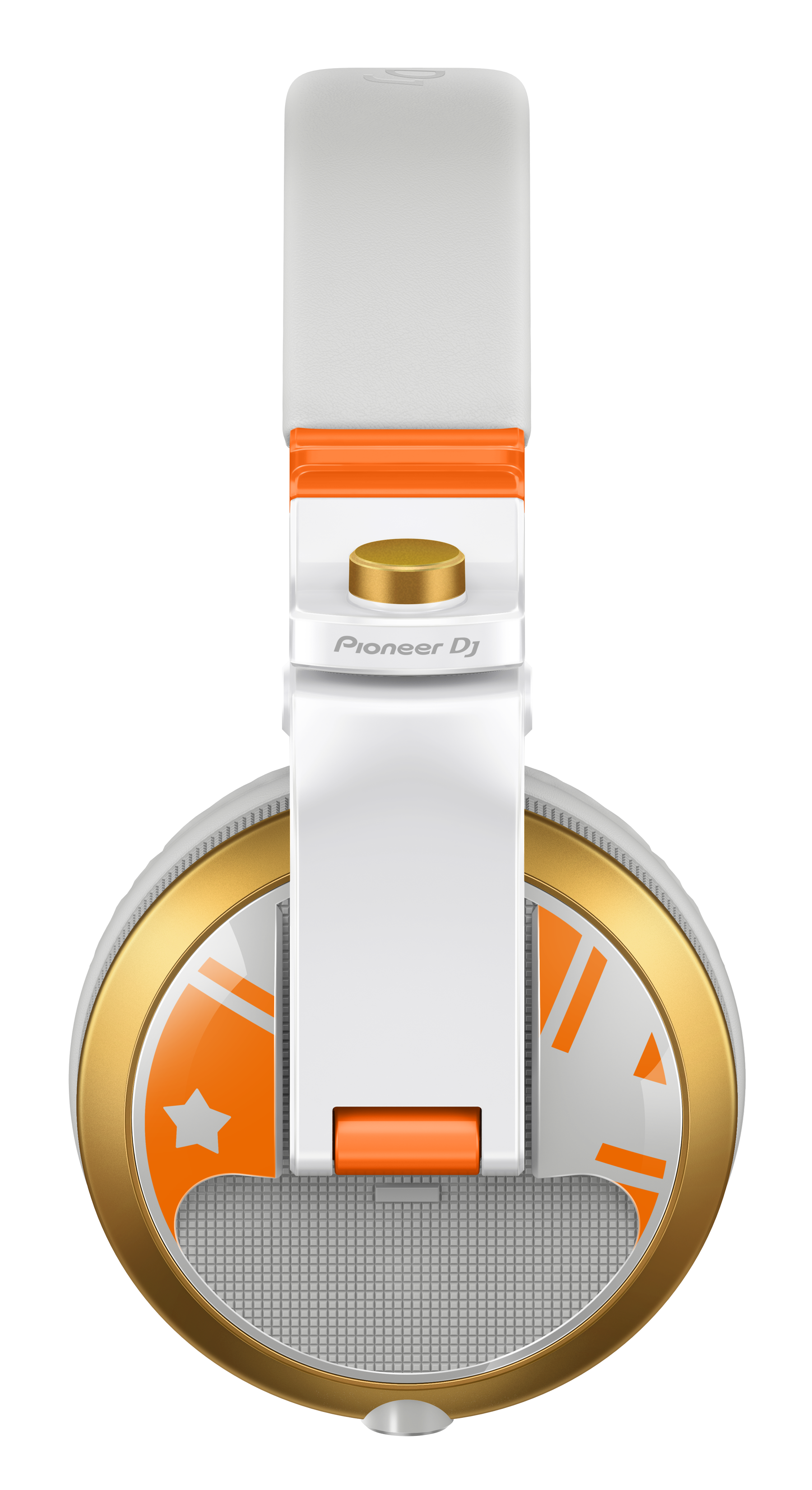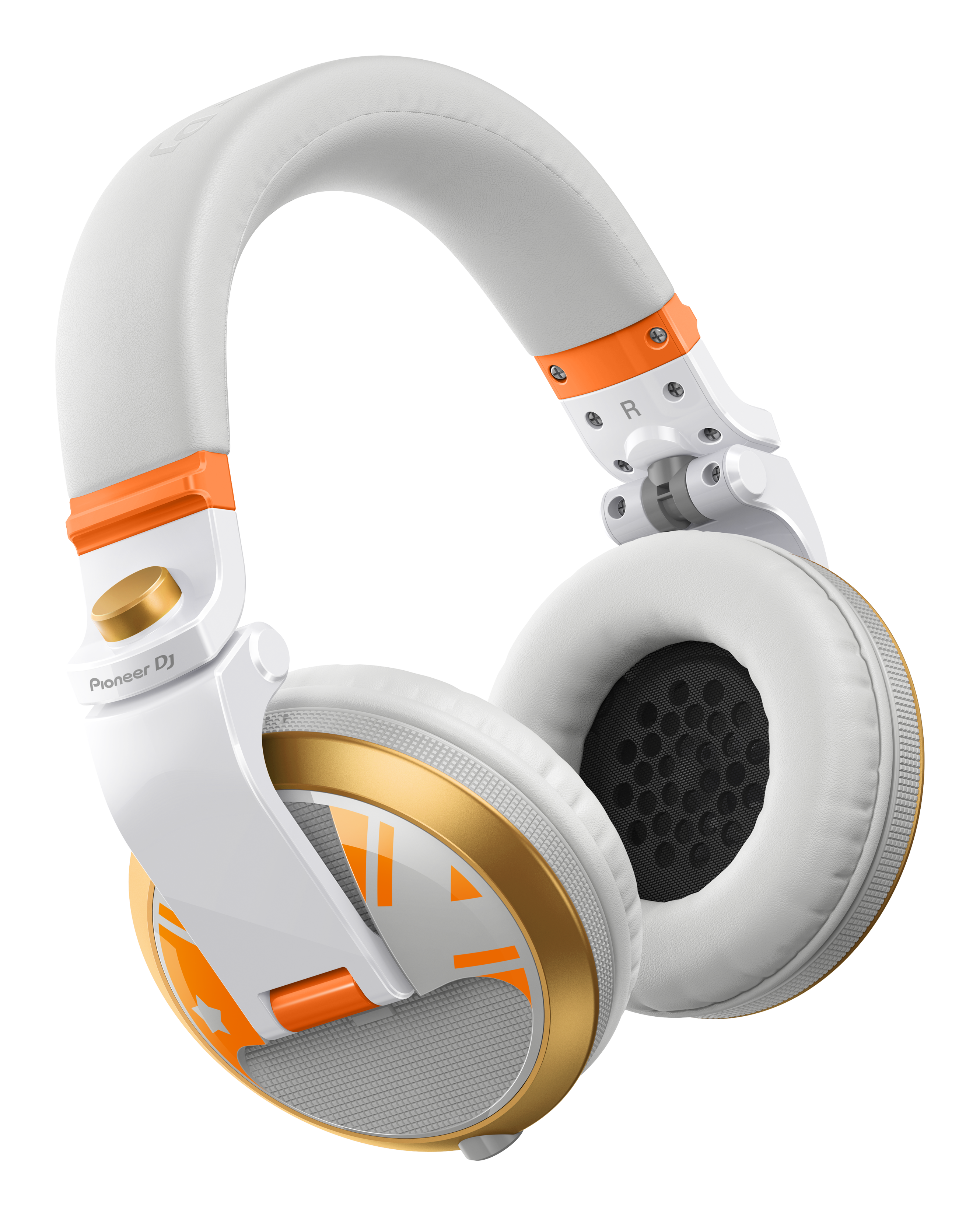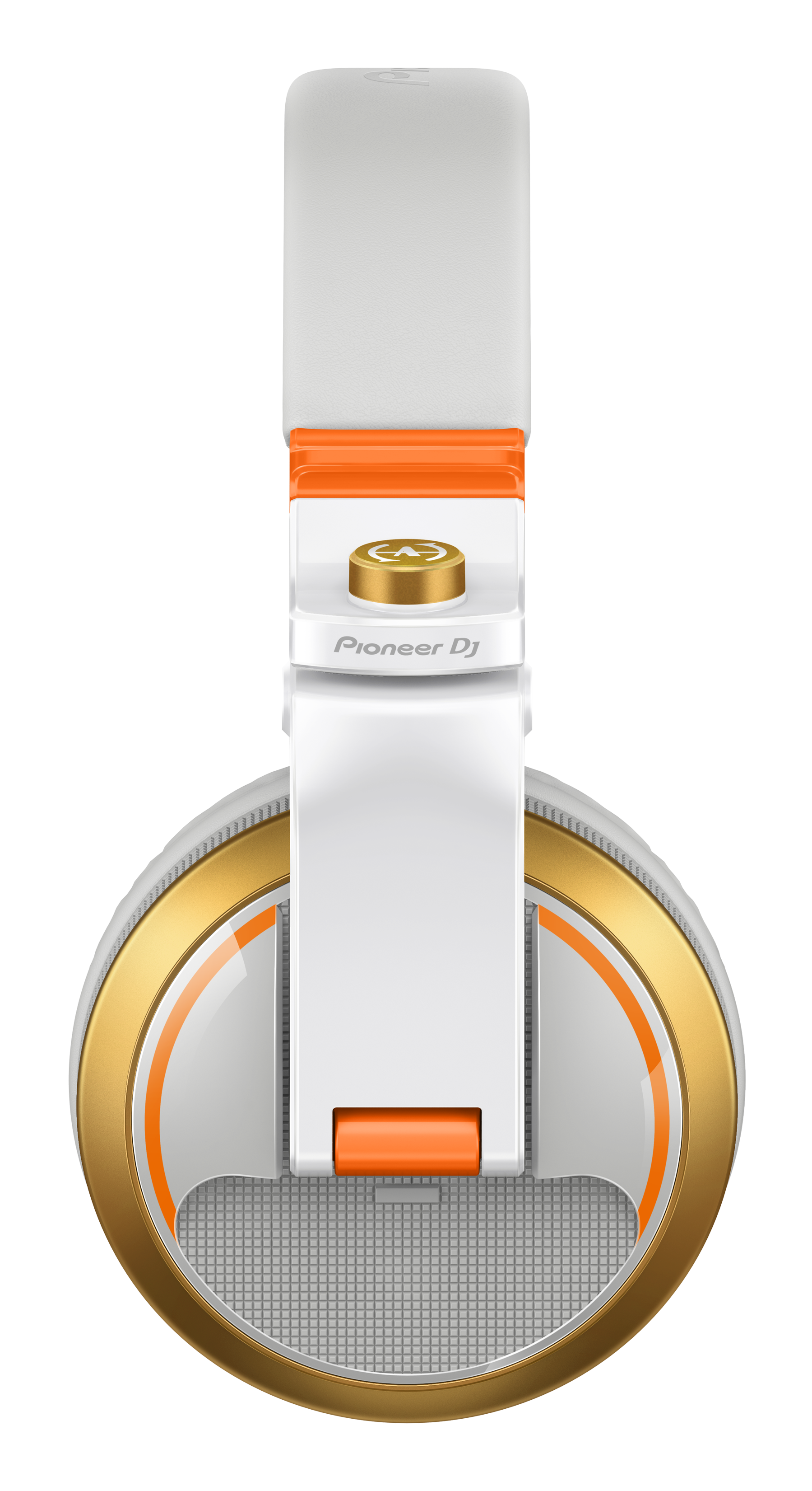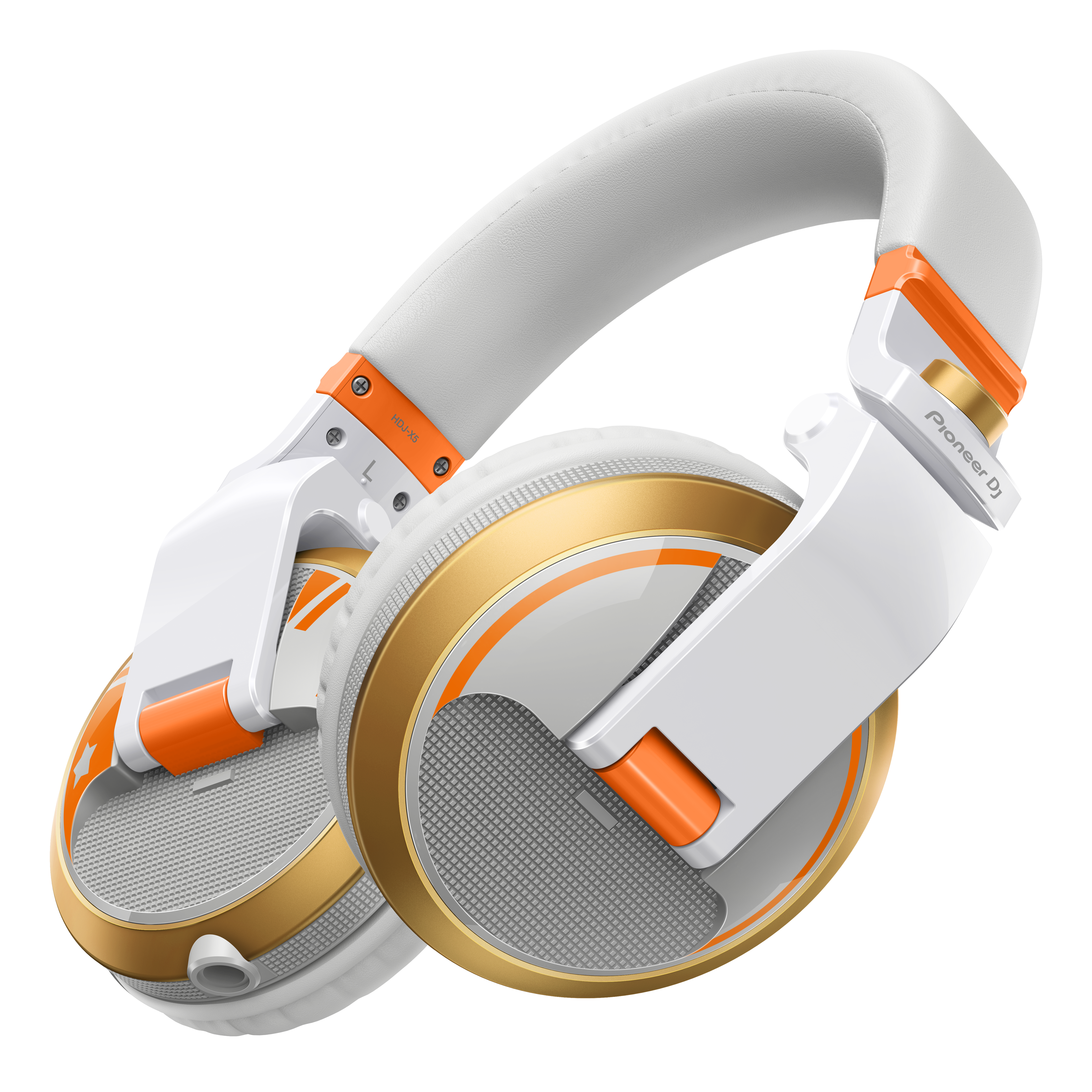 Happy Around!のユニットカラーとエネルギッシュさを表現するために、オレンジ×パールホワイトを基調としたデザインを採用し、ハウジングには左右で異なるオレンジのデザインを施しました。ハウジングリングはゴールドとなっており、エネルギッシュさと同時に高級感を演出します。スイベルキャップにはHappy Around!のマークを採用することで、唯一無二なデザインのDJヘッドホンとなっています。