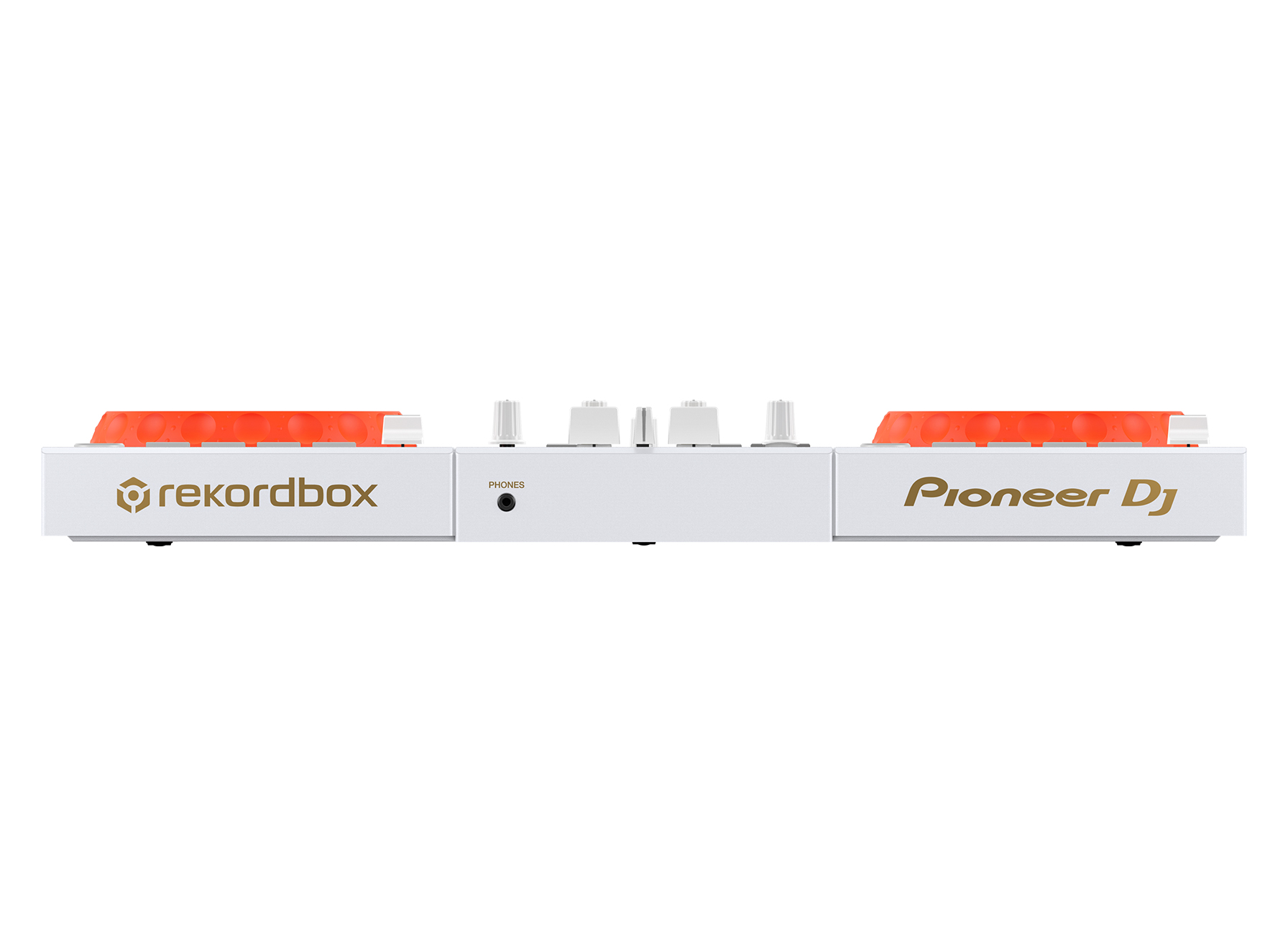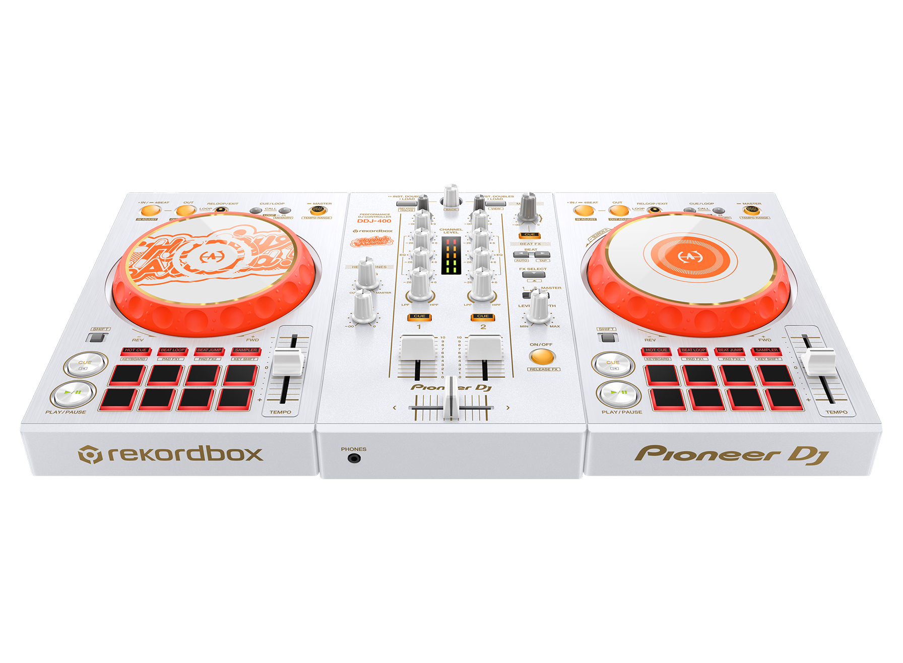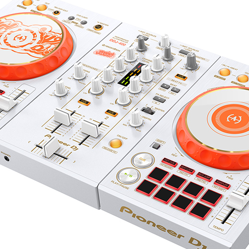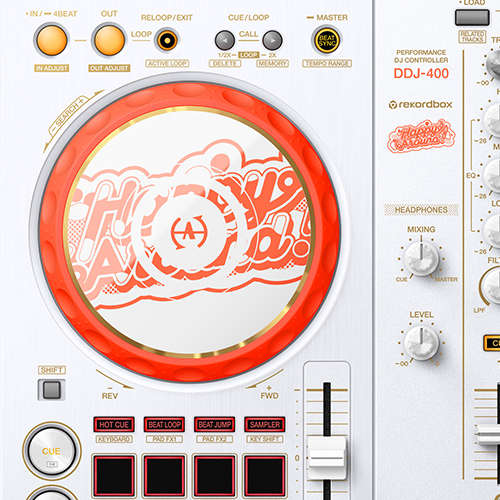 Happy Around!のユニットカラーとエネルギッシュさを表現するために、ボディ全体にはホワイトを基調としたデザインを採用し、ジョグには鮮やかなオレンジを施しました。ジョグ天面とミキサー部にはHappy Around!のオリジナルロゴを採用することで、唯一無二なデザインのDJコントローラーとなっています。