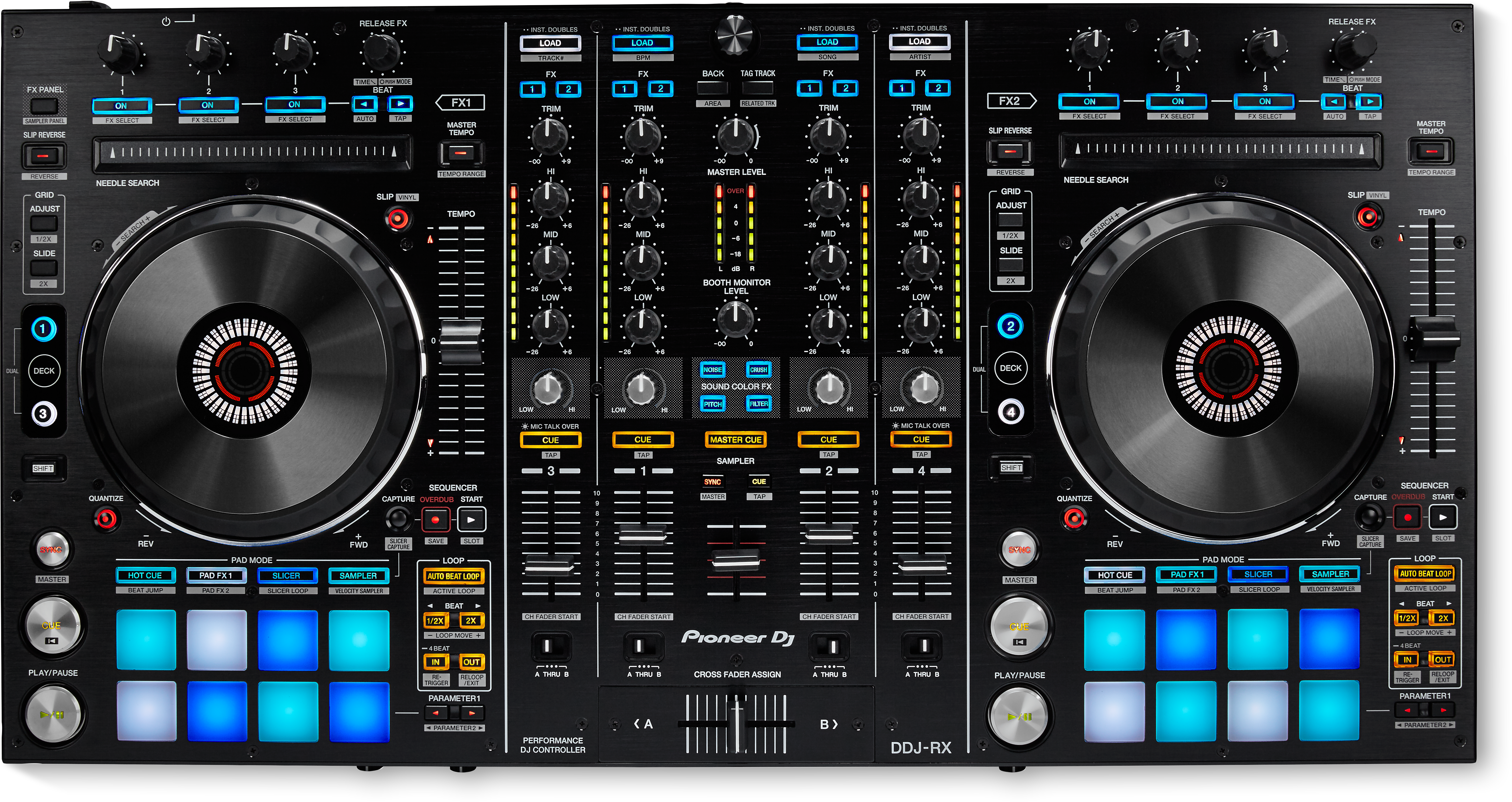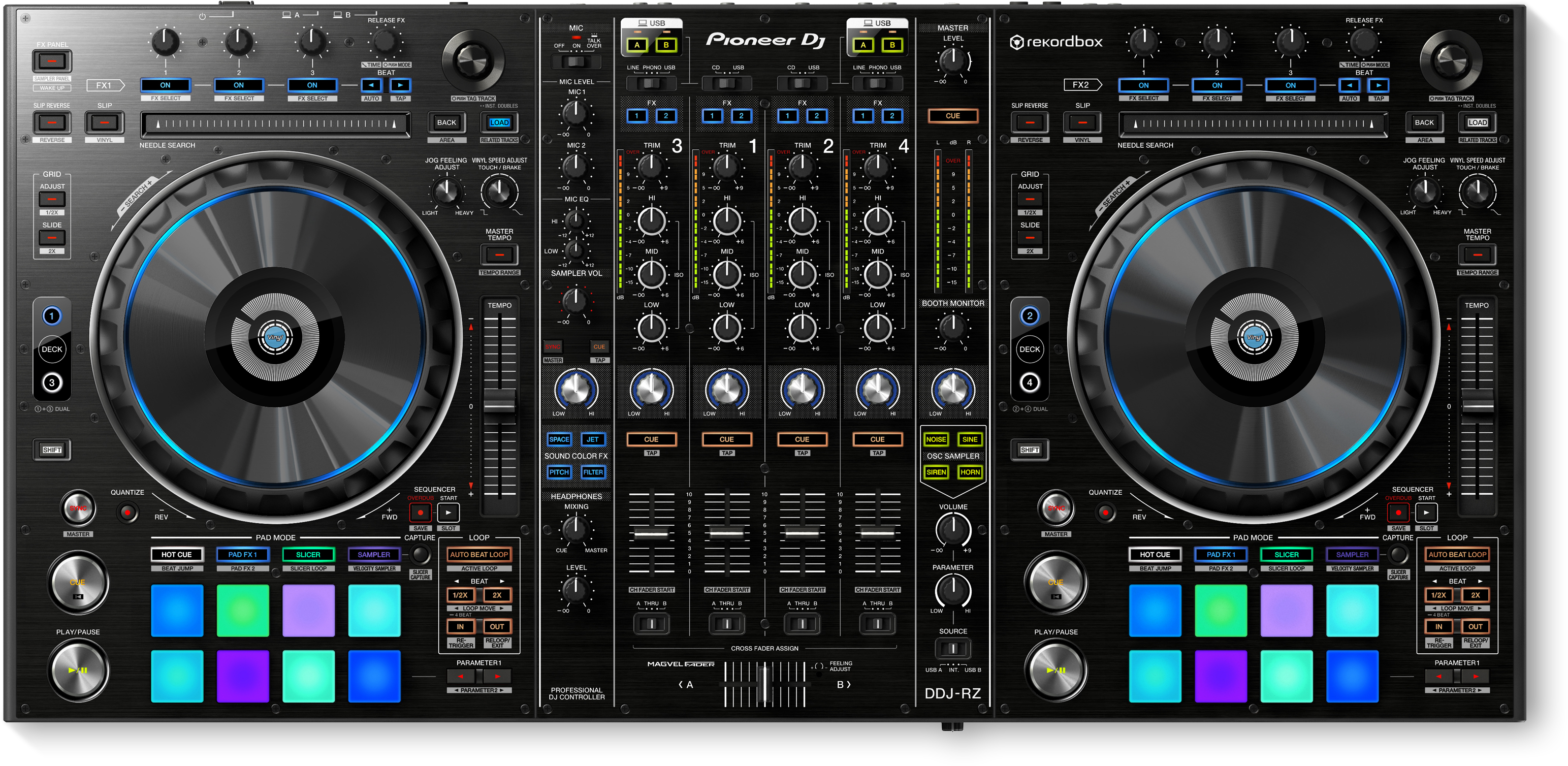 De DDJ-RZ en de DDJ-RX zijn ontworpen en gebouwd om een zo naadloos mogelijke integratie met rekordbox dj en een supersnelle respons te bieden.- Veelkleurige Performance Pads: Met de 16 grote rubberen Performance Pads kun je quantized Hot Cues, Slicer en de nieuwe Pad FX ogenblikkelijk starten.