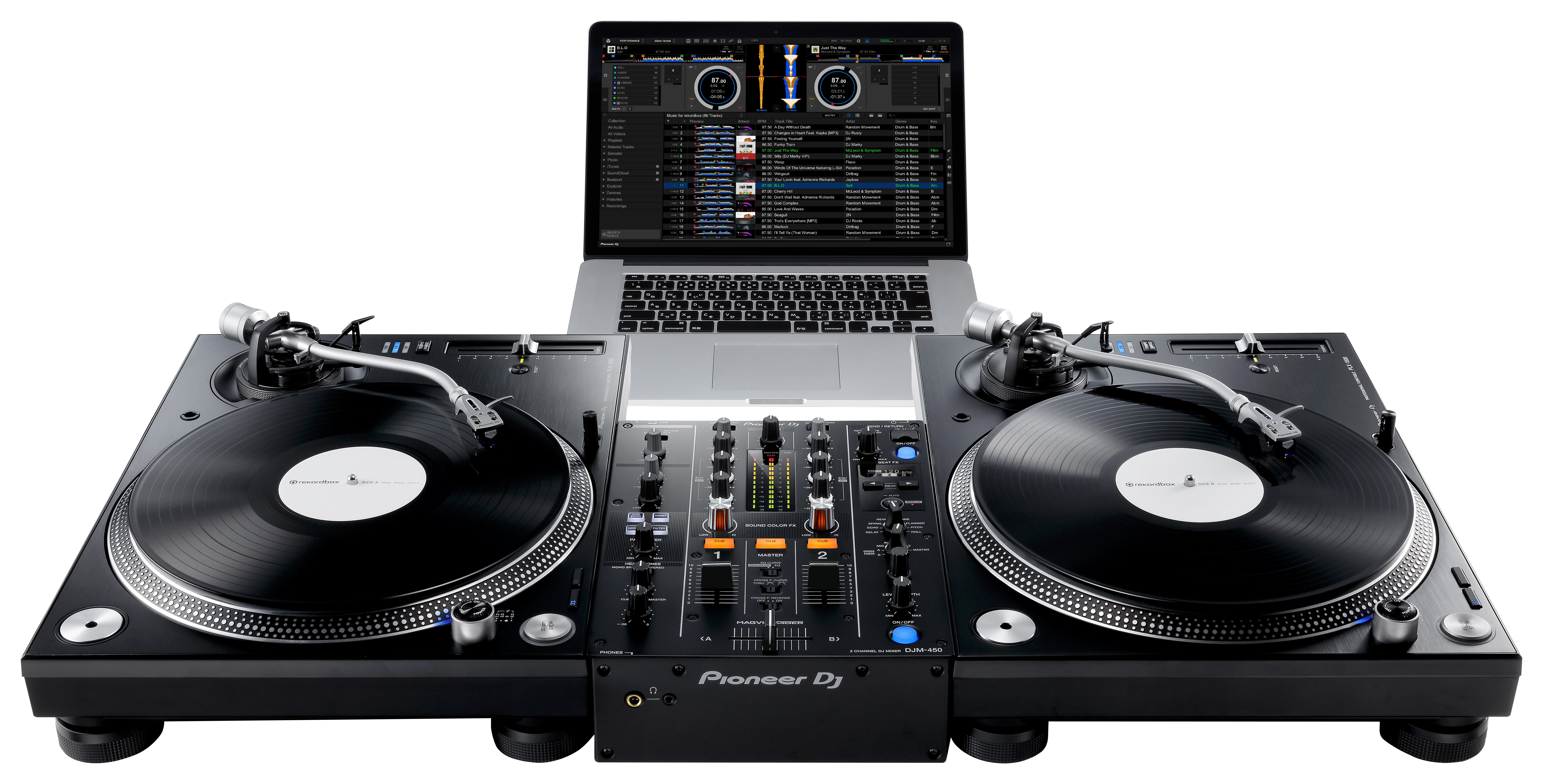 The DJM-450 comes with free licence keys for our professional dj performance applications rekordbox dj and rekordbox dvs so you can play digital tracks from your PC/Mac using turntables and control vinyl (available separately). The mixer’s built-in sound card means you can connect to your computer using a single USB cable.