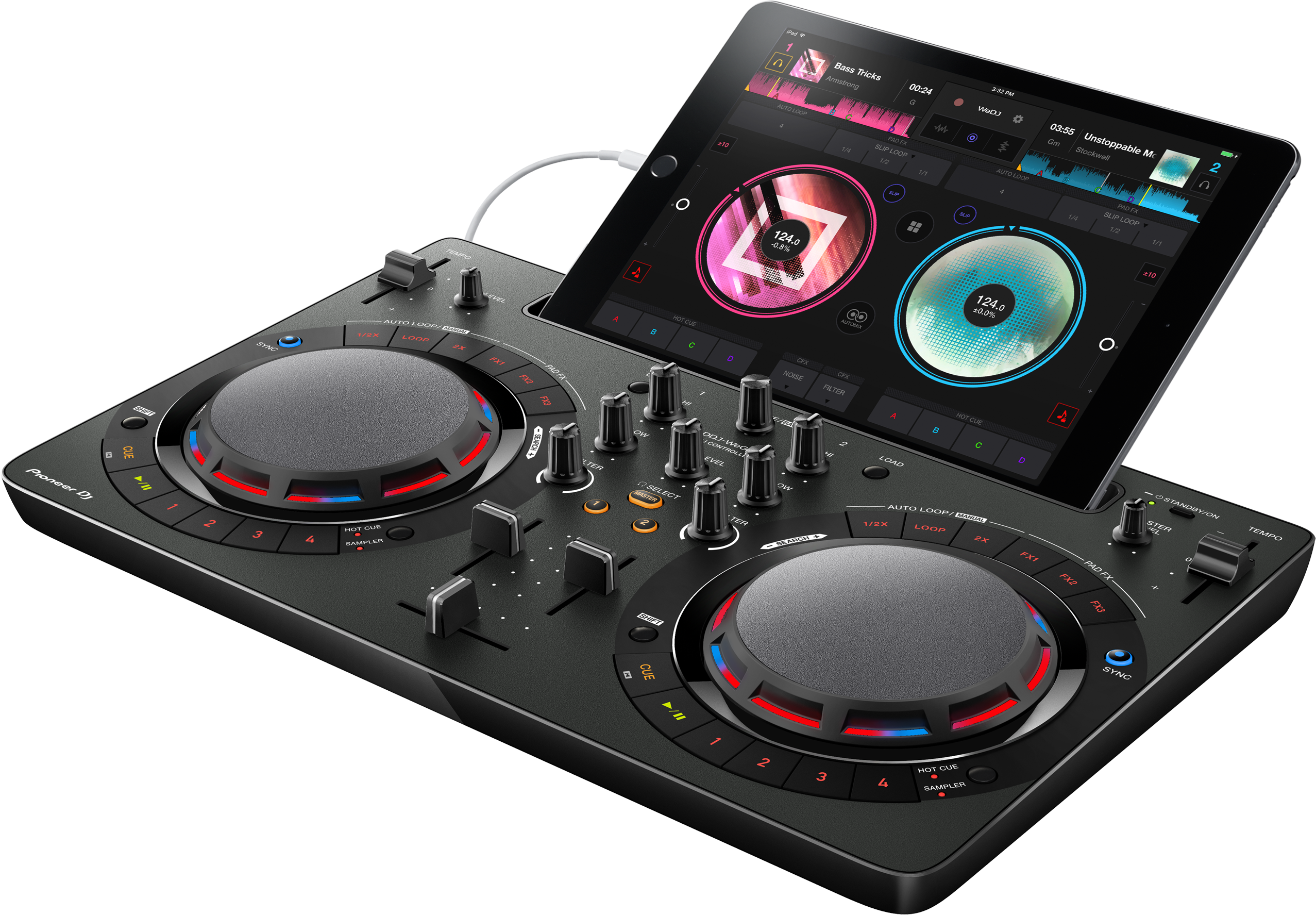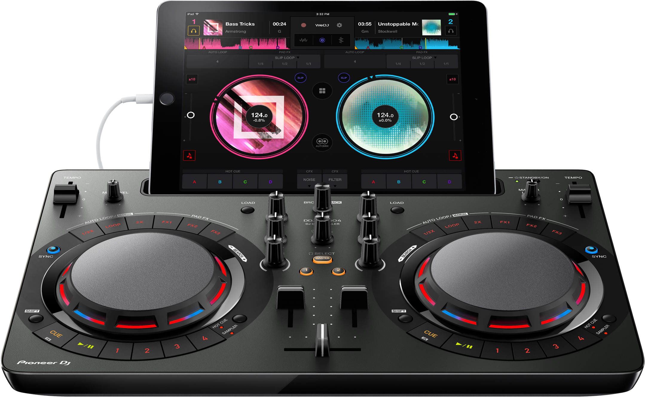 Новый контроллер DDJ-WeGO4 - это идеальный партнер для WeDJ. При подсоединении контроллера экран WeDJ превращается в специализированный интерфейс, оптимизированный для работы с прибором. Работая с помощью джогов, фейдеров и вращаемых регуляторов DDJ-WeGO4, вы получите совершенно новые ощущения от WeDJ. На экране iPad будет показываться информация обо всем, чем вы управляете, а также волновые формы и информация о треках. - Гибкая организация интерфейса