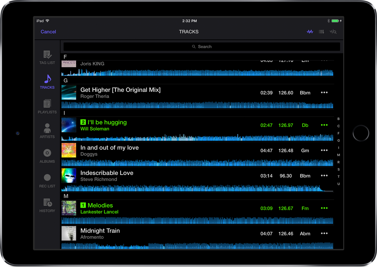 С помощью этого интуитивного приложения, которое выглядит как двухканальный диджейский сетап с волновыми формами, джогом, кнопками play/cue, регуляторами скорости и кроссфейдером, начать микшировать очень легко. Кнопка Sync точно синхронизирует треки, а кнопка Auto Gain автоматически устанавливает громкость на правильный уровень, давая возможность работать с креативными функциями, такими, как горячие точки, петли, эффекты Pad и Combo, которые сделают ваш микс уникальным. Есть даже функция Автомикс, которая плавно выводит следующий трек перед окончанием текущего. И чтобы поднять свои выступления с WeDJ на новый уровень, вы можете подключить к iPad контроллер DDJ-WeGO4 и управлять приложением с помощью реальных органов управления.