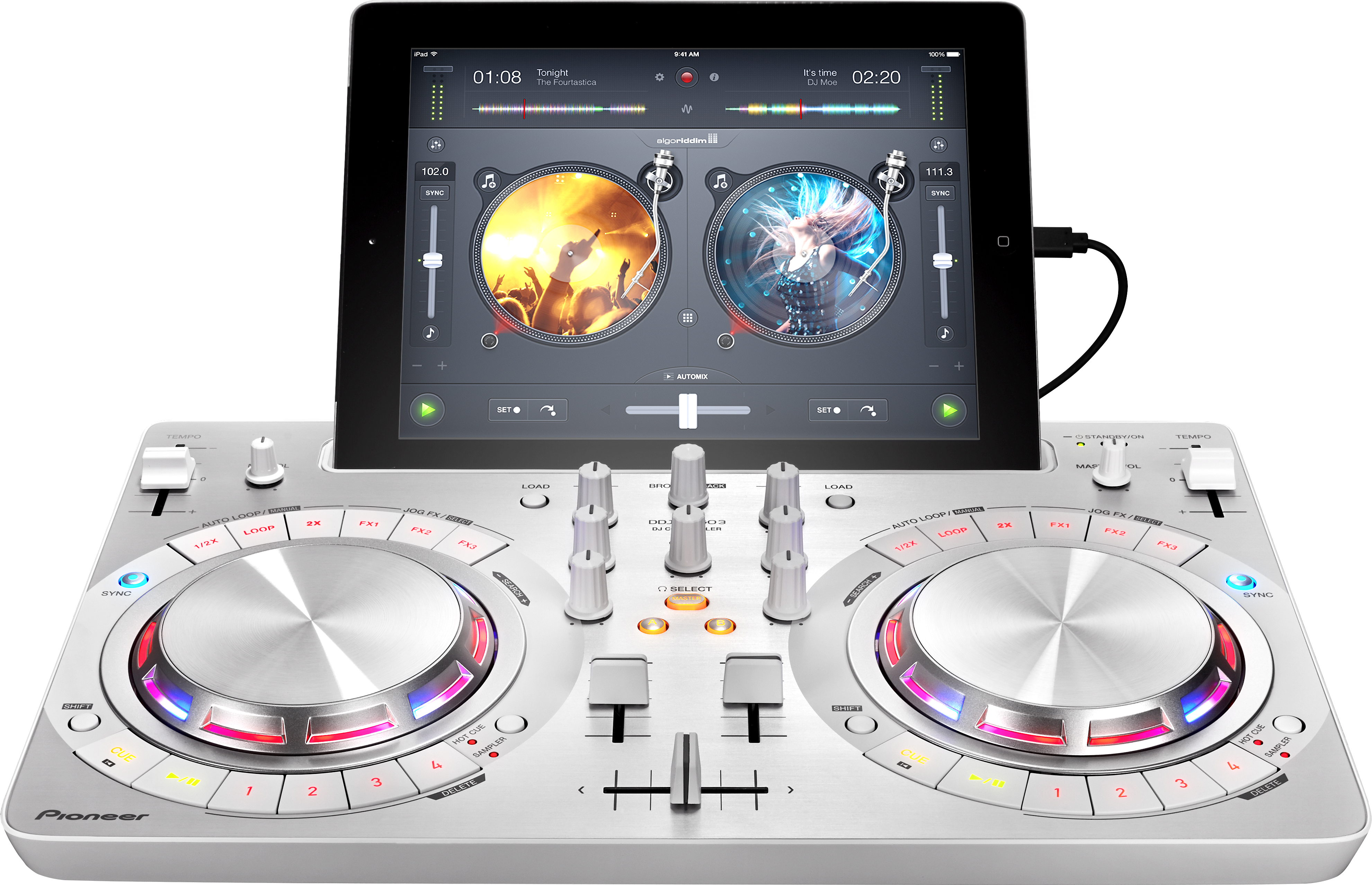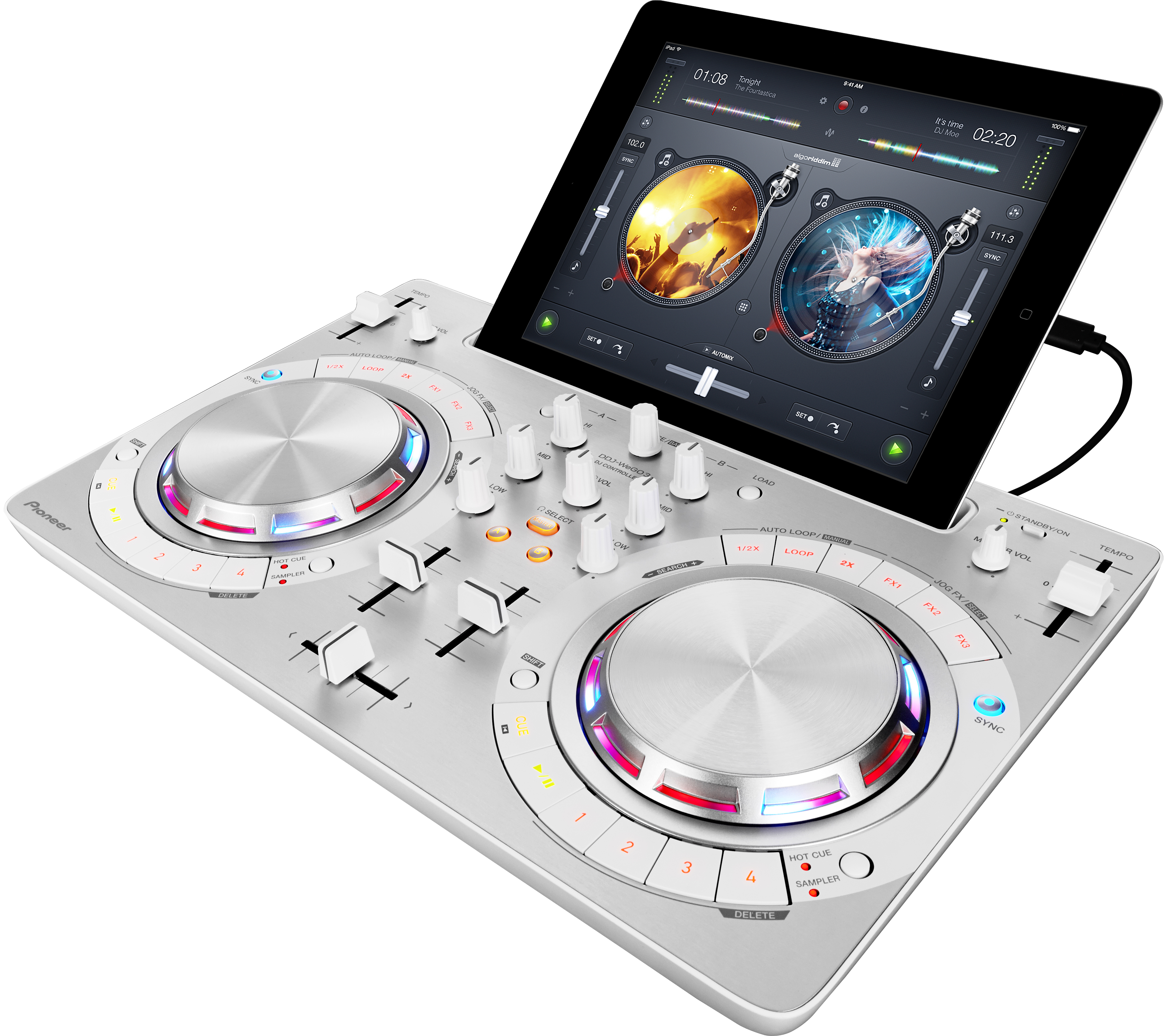 DDJ-WeGO3 предлагает вам широкий выбор: подключите его к iOS устройству с приложением Algoriddim djay 2 и используйте джоги, кнопки и ручки для игры треков из вашей библиотеки Spotify или iTunes. Или подключите PC/Mac и управляйте DJ программами, такими как djay (только для Mac) или Virtual DJ 8 Limited Edition.